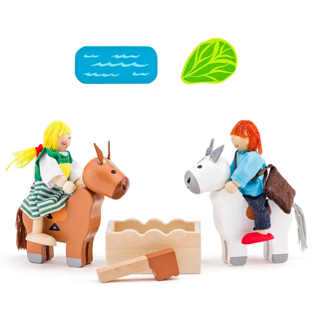 Produkt obsahuje 2 drevené kone a 2 bábiky, ktorých nohy a ruky boli vyrobené z drôtu, takže sú tvarovateľné. To umožňuje deťom sadnúť bábiky na kone alebo do kabíny prepravcu a nastaviť ich do rôznych pozícií, ako je kľačanie, ležanie alebo roztiahnutie rúk.