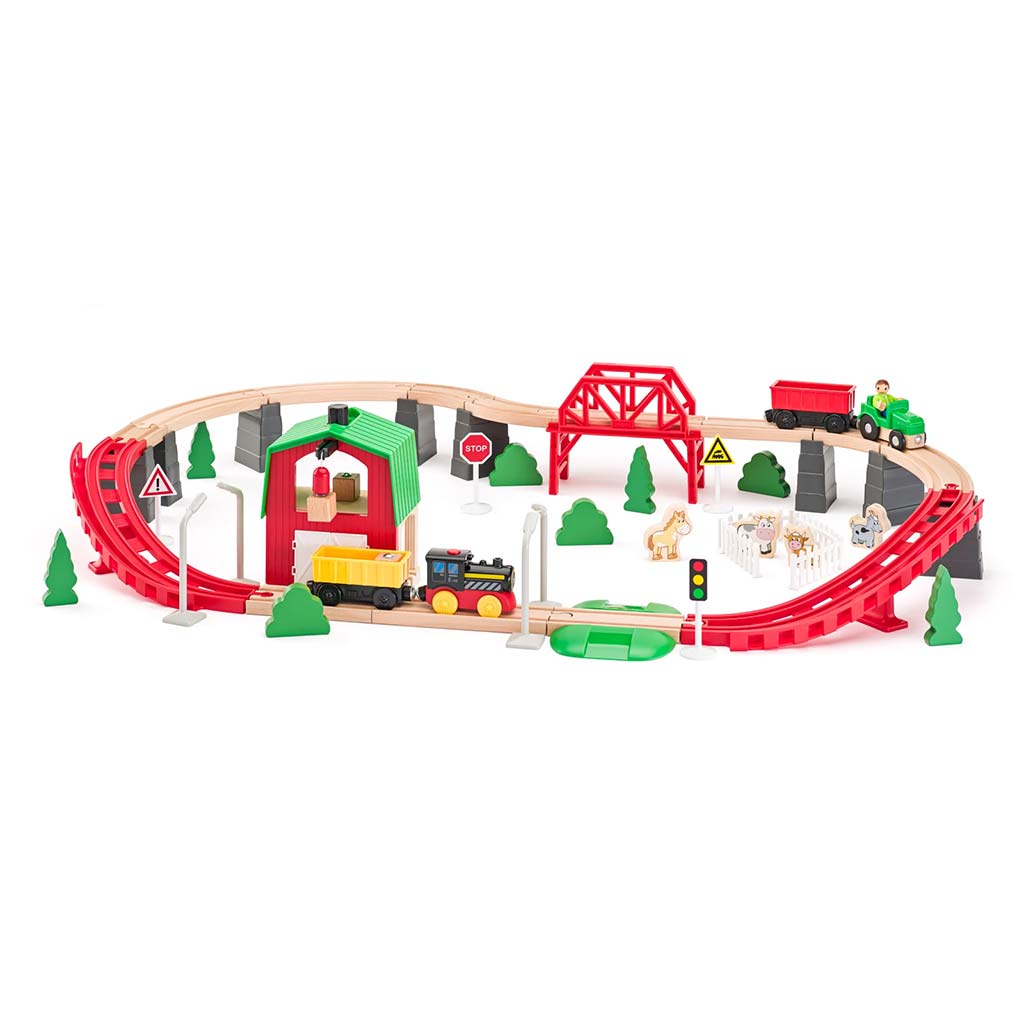 Drevená poľnohospodárska železnica s vlakom a ďalšími doplnkami — 60-dielna sada — prináša do detskej izby skutočné dobrodružstvo. Detailne prepracovaná dráha s farmárskou tematikou, mostami, stúpaniami a zákrutami robí hru ešte napínavejšou. Okrem lokomotívy a vagóna obsahuje súprava traktor, zvieracie figúrky, stromy, dopravné značky a útulnú hospodársku budovu, takže si tvoje dieťa môže znova a znova vytvárať vlastné vidiecke príbehy.