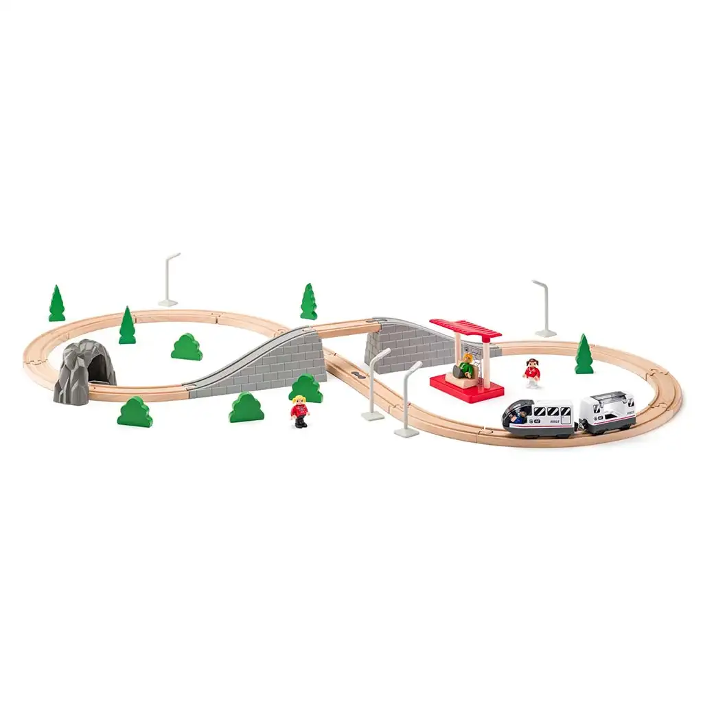 Táto železničná súprava je ideálnou voľbou, ak vaše dieťa miluje vlaky a realistické scenérie. Moderný osobný vlak s dvoma vozňami prechádza traťou, zatiaľ čo prechádza tunelom, prechádza po moste a potom zastaví na krytej stanici, kde už čakajú cestujúci. Dômyselne navrhnutá trať obohacuje hru o vzrušujúce výškové rozdiely a zákruty.