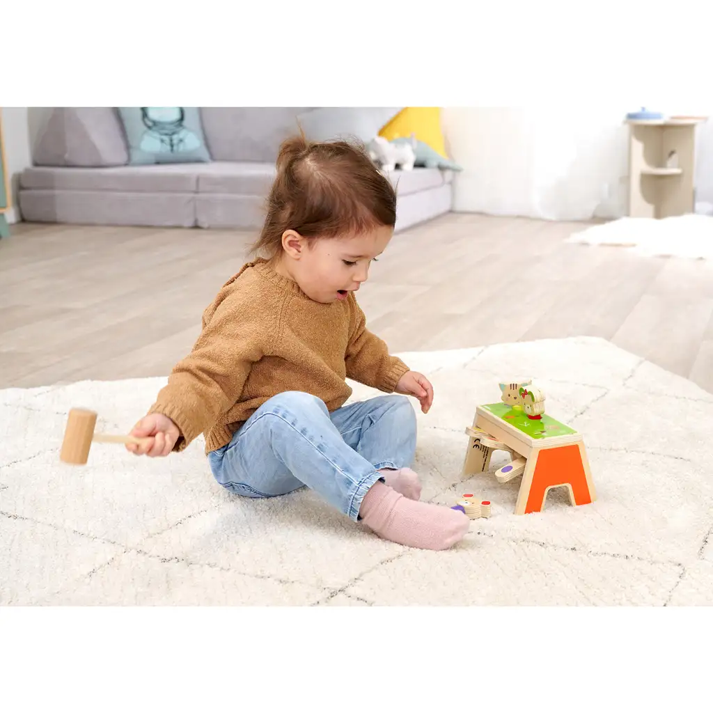 Hračka je navrhnutá úplne bezpečne, drevené diely sú zaoblené a prispôsobené malým detským rúčkam. Tri farebné, usmiate zvieratká – medvedík, psík a mačička – sa objavujú v rôznych farbách a polohách, aby ich dieťa mohlo znovu a znovu kladivkom zatĺkať späť na miesto.