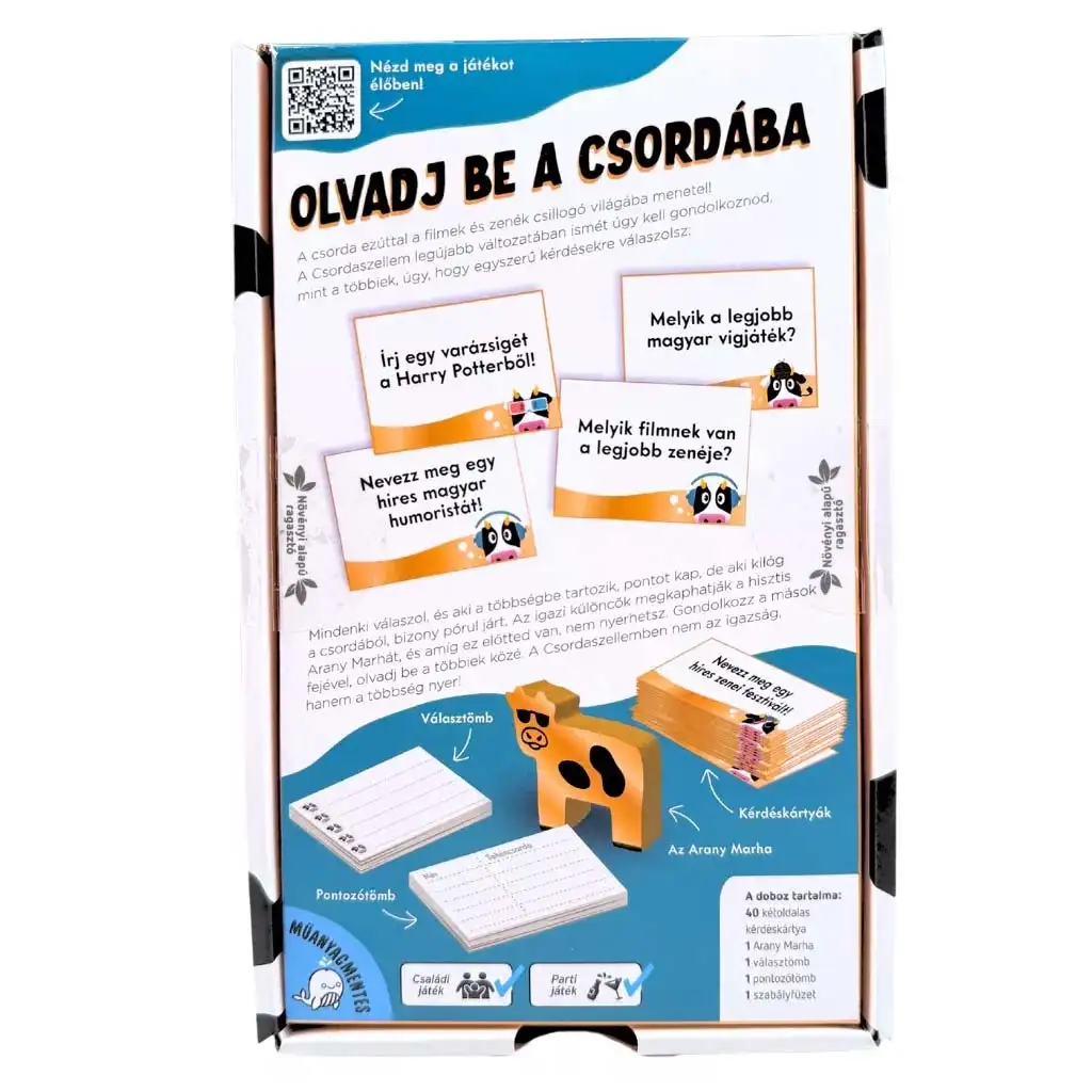 Csordaszellem – Múúzik a Mozik je svižná párty hra plná smiechu, ktorá tentoraz zavedie hráčov do sveta filmov a hudby. Cieľ zostáva geniálne jednoduchý: musíš rozmýšľať ako ostatní. Nezáleží na tom, čo je správna odpoveď, ale na tom, či trafíš názor väčšiny.