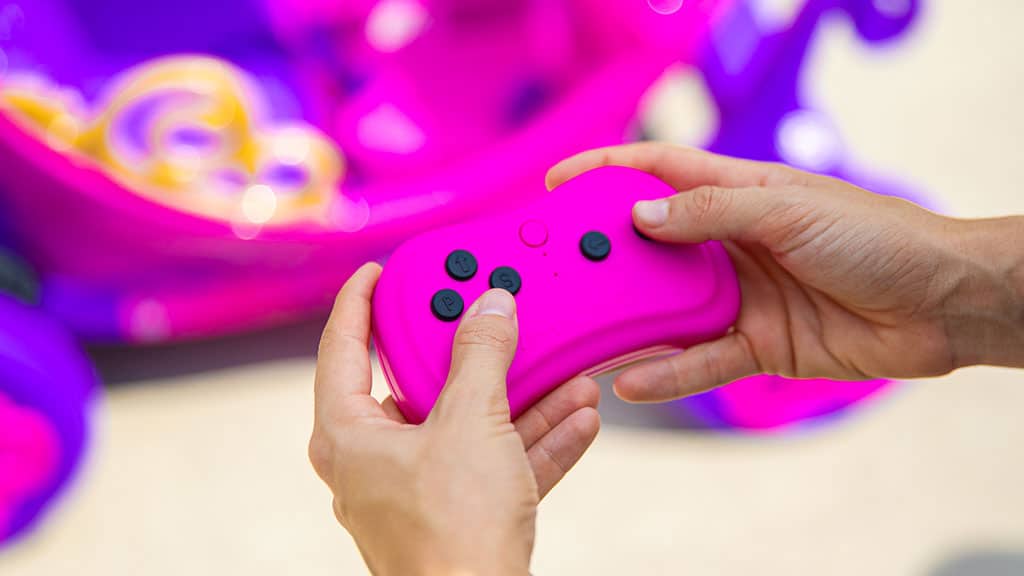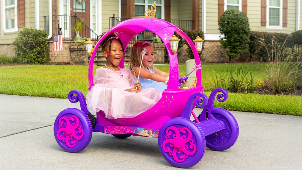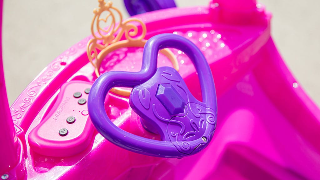 24-voltová Disney Princezné kočiar od Dynacraft je ružovo-fialové, trblietavé autíčko v tvare koča, ktoré zdobia filigránske ozdoby, dekoratívne lampáše a odnímateľná predná korunka – ideálne na hranie rolí a splnenie princeznovských snov.