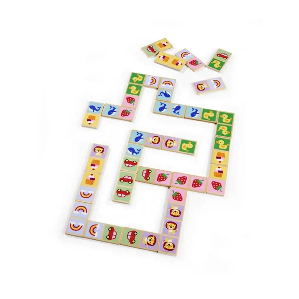 Toto domino nie je len zábavné, ale skvele rozvíja pozorovacie schopnosti, rozpoznávanie farieb a tvarov, ako aj schopnosť párovania. Deti sa učia hrou: hľadajú rovnaké obrázky, spájajú ich a môžu stavať dlhé, farebné dominové reťazce. Drevené dominá sa ľahko držia v ruke, sú pevné a vydržia aj pri intenzívnom hraní.