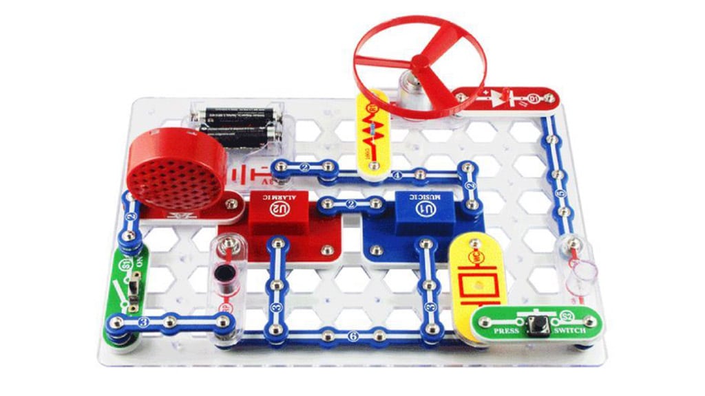 Súprava Snap Circuits 100 Explorer Kit obsahuje 28 farebne označených súčiastok, pomocou ktorých môžu deti stavať skutočné, funkčné elektrické obvody. S priloženým návodom môžu vyskúšať viac ako 100 rôznych projektov, napríklad hlasom ovládané spínače, zvoniace zvončeky, lietajúce taniere alebo policajné sirény.