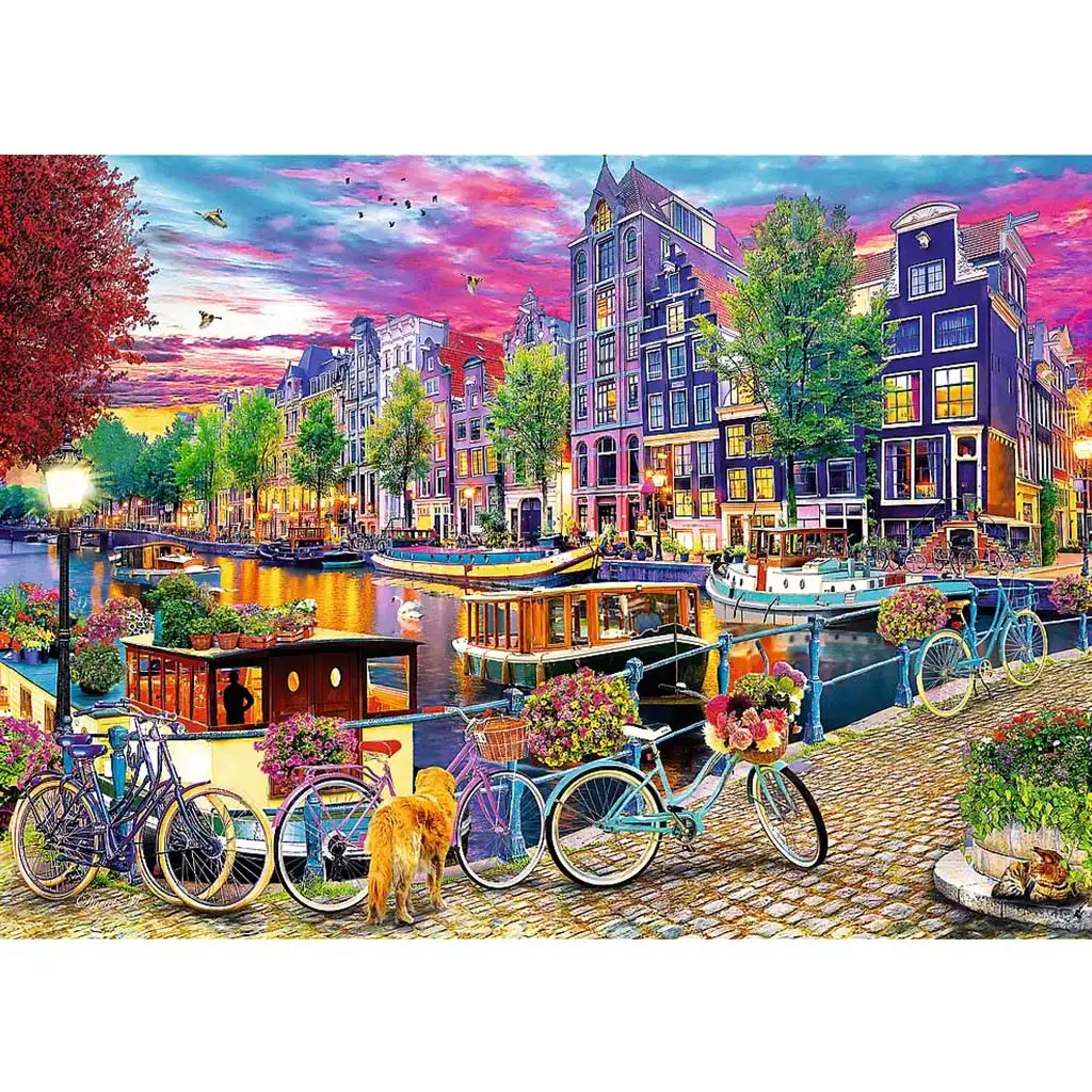 Na prvom obrázku je čarovná parížska ulička s mačacími hlavami, v pozadí s Eiffelovou vežou, kaviarňami, červenými slnečníkmi, elegantnými balkónmi a farebnými kvetinovými aranžmánmi. Druhý motív vás zavedie popri kanáloch Amsterdamu, kde si v spoločnosti útulných domov, bicyklov, kvetinovej výzdoby a psíka môžete vychutnať pokojnú atmosféru pri vode v svetle zapadajúceho slnka.