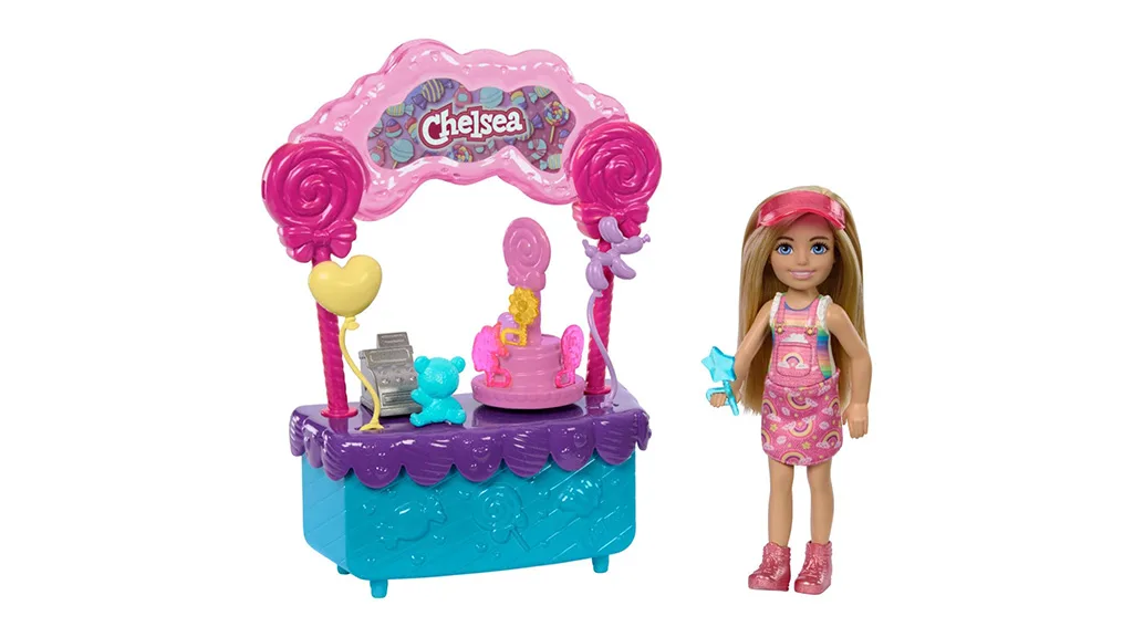 Deti si môžu vychutnať sladkú pochúťku s Chelsea a jej súpravou hračiek Lollipop Candy Stand. V roztomilom ružovom slnečníku a šatách, Chelsea prevádzkuje svoj stánok s lahôdkami z lízaniek, roztomilým plyšovým medveďom a oslavovými balónmi.