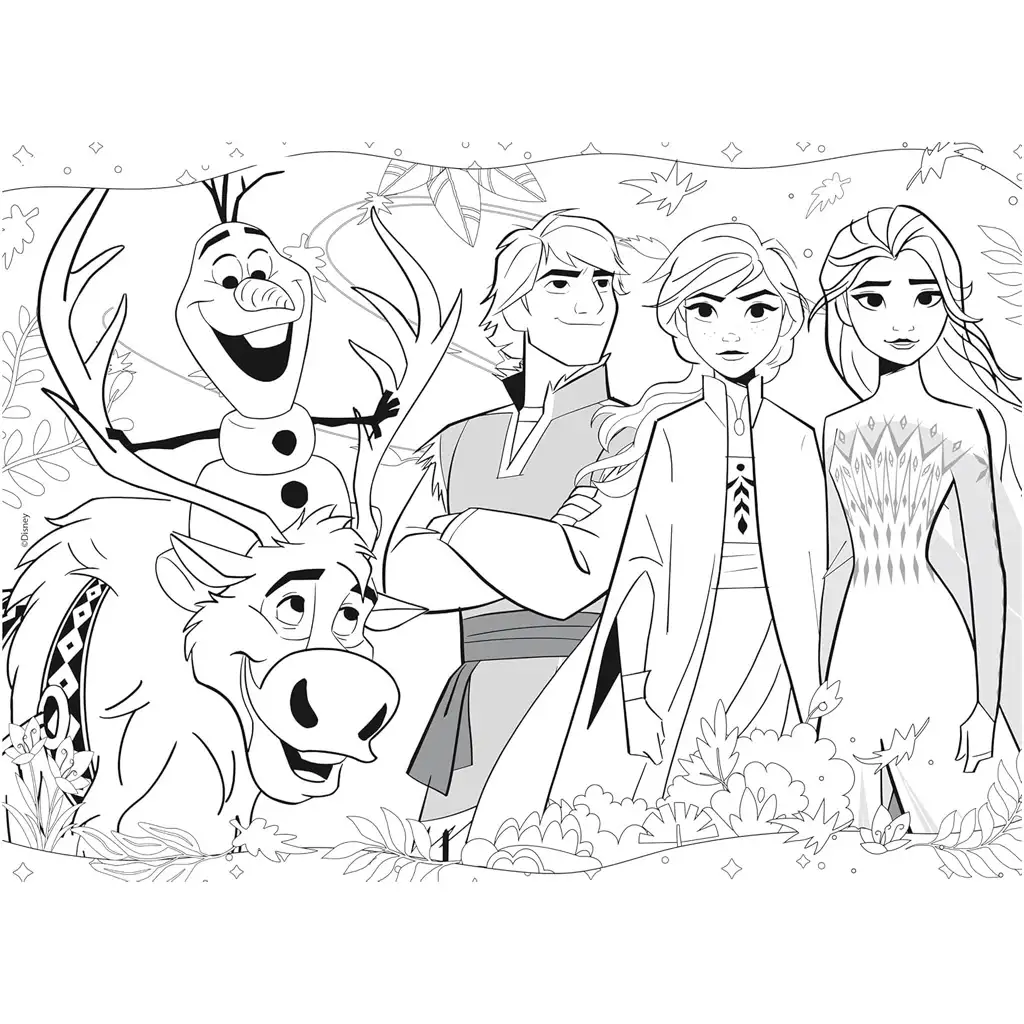 Puzzle zobrazujú Elsinu, Anninu, Kristoffovu, Olafovu a Svenovu priateľskú chvíľu – celá scéna sa odohráva na jesennom lesnom pozadí, ktoré vnesie do detskej izby príjemné a teplé farby. Obrázok dokonalo vystihuje ducha súrodeneckej súdržnosti a dobrodružstva, ktoré sú tak typické pre príbehy Ľadového kráľovstva. Na druhej strane sa nachádza čiernobiela omaľovánka s tou istou scénou, ktorá rozvíja kreativitu a jemnú motoriku.