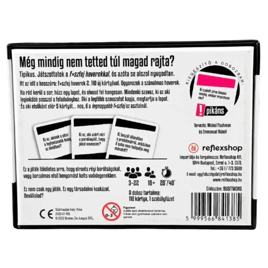 Fxszfej kamaráti 2 spoločenská hra – brutálne úprimné a smiechom do sĺz naplnené pokračovanie párty hry, v ktorej sa opäť vaša partia dostáva do centra pozornosti. Ťaháš kartu, prečítaš otázku nahlas a potom každý bez rozmýšľania ukáže prstom na toho, na koho sa situácia „najviac hodí”. Tu niet miesta na vytáčky, len trápne pravdy, hlasné hádky a ten druh smiechu, z ktorého ťa začne bolieť brucho.