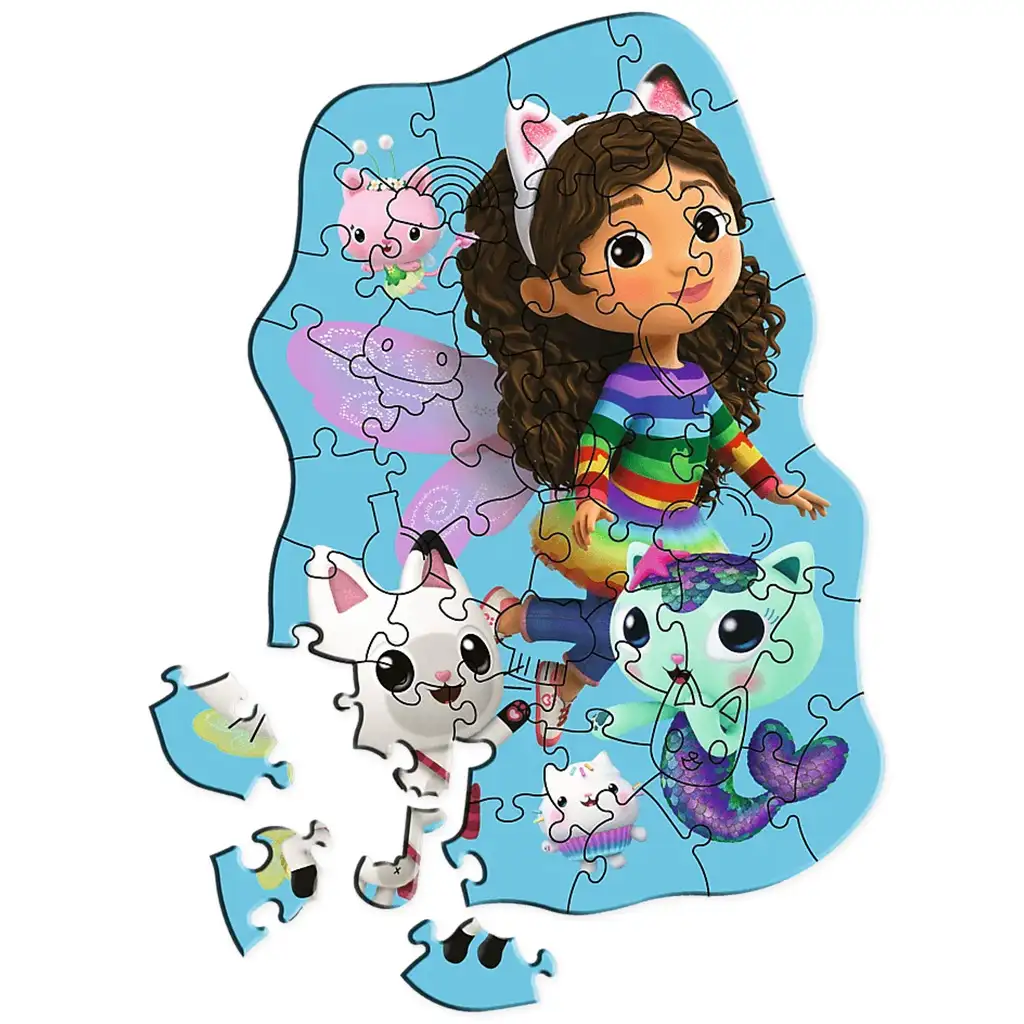 Ak vaše dieťa miluje populárny animovaný seriál na Netflixe s názvom Gabin domček, tento špeciálny 50-dielny obrysový drevený puzzle mu určite prinesie radosť! Puzzle zobrazuje veselú a magickú scénu, kde Gabi a jej rozkošní mačací priatelia – Pandy Paws, DJ Catnip a MerCat – zažívajú rozprávkové dobrodružstvo.
