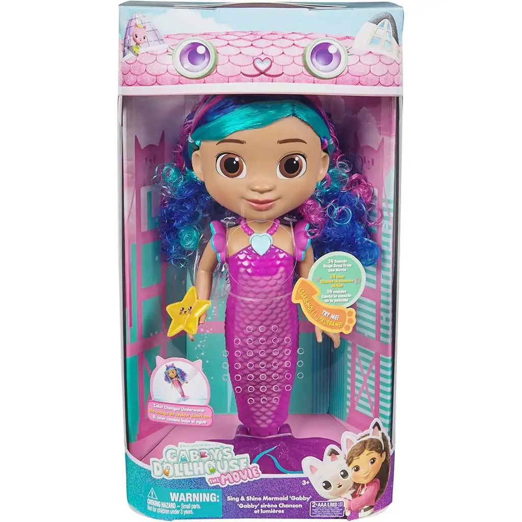 Gabin domček pre bábiky – Film: Spievajúca a žiariaca morská panna Gabika prináša do detskej izby čarovný zážitok priamo zo sveta obľúbenej rozprávky. Táto výnimočná morská panna Gabika nie je len krásna, ale aj interaktívna: spieva, svieti a počas hry vytvára skutočnú rozprávkovú atmosféru. Trblietavý, farebne sa meniaci chvost morskej panny okamžite upúta pozornosť detí, najmä keď sa vo vode ešte viac zvýrazní.
