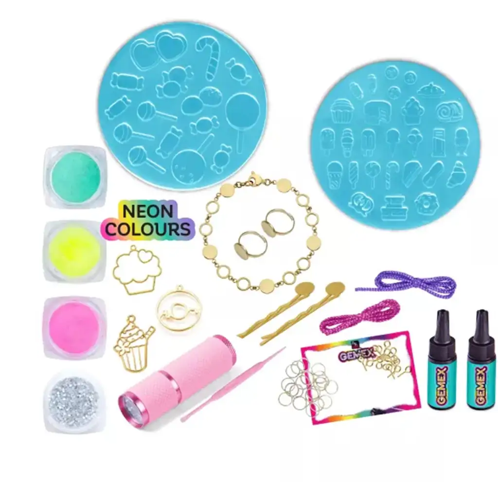 So súpravou si deti môžu vyrobiť vlastné šperky, napríklad prstene, náramky, sponky do vlasov alebo prívesky, a to kombinovaním neonových gélov a trblietok. Rôzne formy v tvare sladkostí – šišky, lízanky, muffiny – si zamiluje každé malé tvorivé srdiečko. Trblietky zamiešané do gélu ešte viac zvýraznia výsledný efekt, a priložená UV lampa za pár sekúnd stvrdne tvary z gélu.