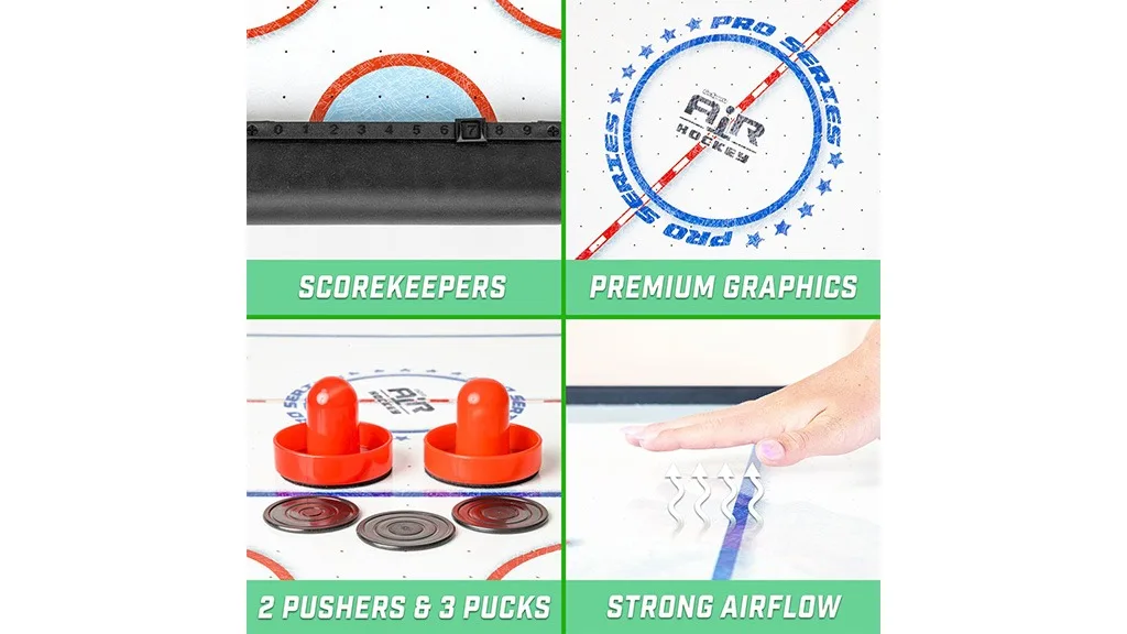 Hra má stôl s návrhom ľadovej plochy, s predinštalovaným ventilátorom pre hladký priebeh hry a ľahko uchopiteľnými pukmi. Deti vo veku 6 rokov a staršie môžu zlepšiť svoje jemnomotorické zručnosti a rozvíjať sociálne zručnosti hraním tejto klasické hry s priateľmi a rodinou. Predmontovaný stôl je ideálny pre mobilnú zábavu a môže sa hrať na akomkoľvek rovnom povrchu.