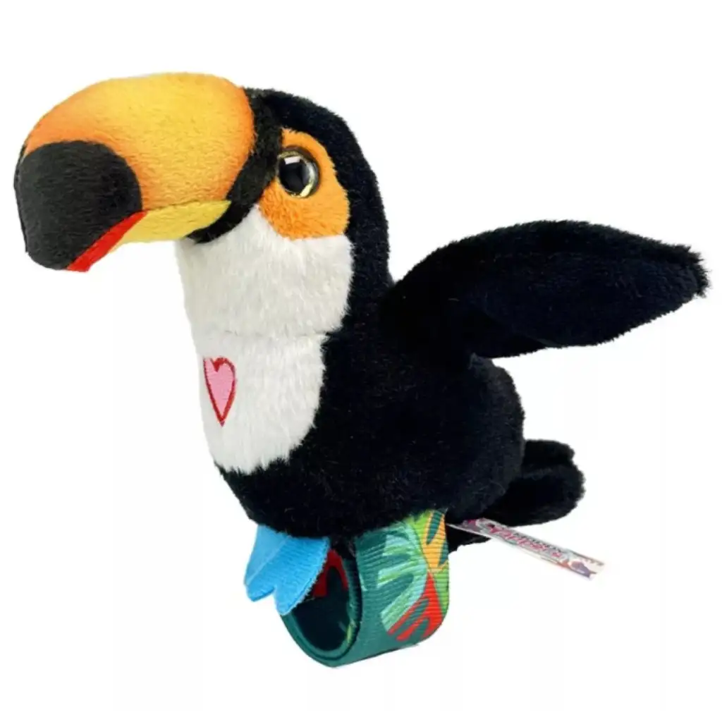 Tu je Happy Yappers! Pripni si ho na zápästie, stlač srdiečko a zábava sa môže začať! Happy Yappers Tukan nie je len mäkká, objímateľná plyšová hračka, ale aj interaktívny kamarát, ktorý vždy prinesie dobrú náladu do života detí. Môžeš sa s ním rozprávať, zopakuje po tebe, spieva, máva krídlami a dokonca vie komunikovať aj so svojimi kamarátmi! Vďaka funkcii slap-náramku si ho deti môžu ľahko pripnúť na zápästie a vziať svojho obľúbeného spoločníka kamkoľvek so sebou. Farebný, veselý dizajn a milý tukan sa rýchlo stanú obľúbenými medzi deťmi, pričom rozvíjajú predstavivosť, schopnosti hrania rolí i komunikáciu. Figúrky Happy Yappers už len čakajú, aby prileteli do tvojho domova a priniesli veselé chvíle do každodenného života.
