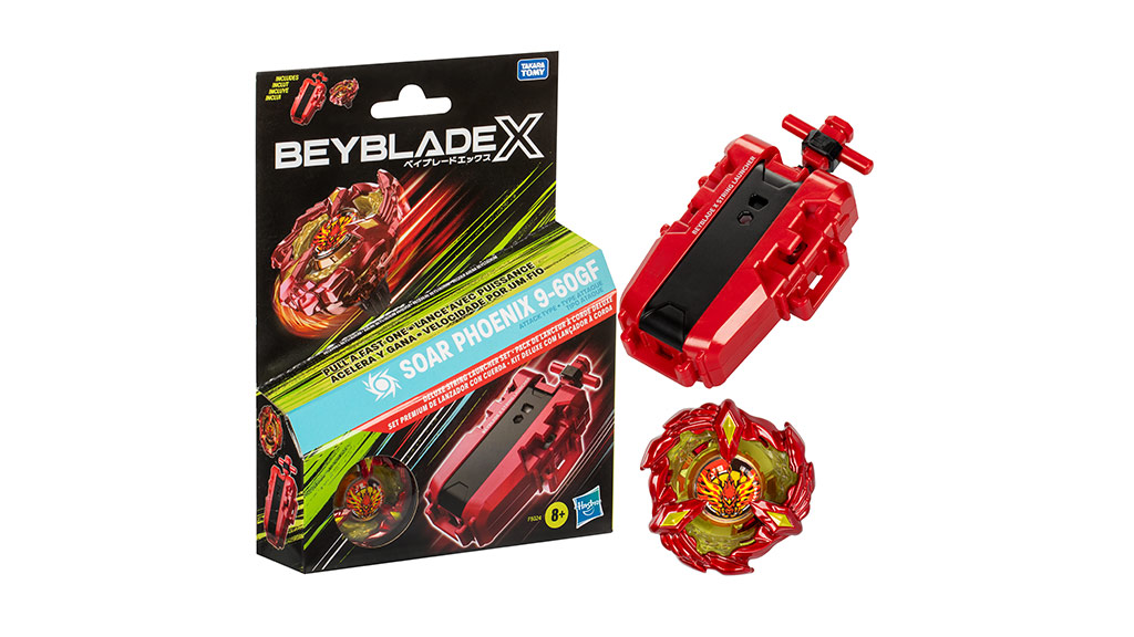 Deti môžu zrýchliť svoju hru s pomocou Beyblade X Soar Phoenix Deluxe String Launcher Set, ktorý obsahuje Soar Phoenix 9-60GF Attack Type točiaci vrch a deluxe zipsový vystreľovač. Okrem toho si môžu vybrať aj Beyblade X Official Winder Launcher, ktorý má 10-palcový ťahací zips pre super rýchle súboje.