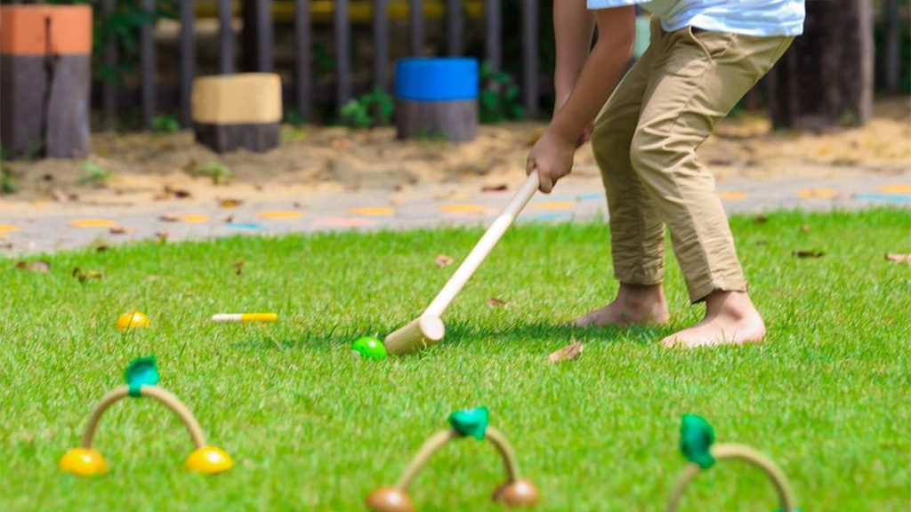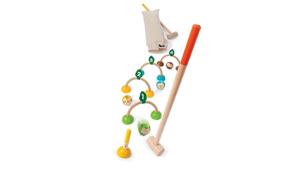PlanToy Croquet súprava prináša udržateľný zvrat do klasickej vonkajšej hry. Deti sa môžu naučiť hru s drevenou súpravou, ktorá obsahuje štyri loptičky s motívom zvierat, dve palice, štyri bránky a jeden cieľový stojan.