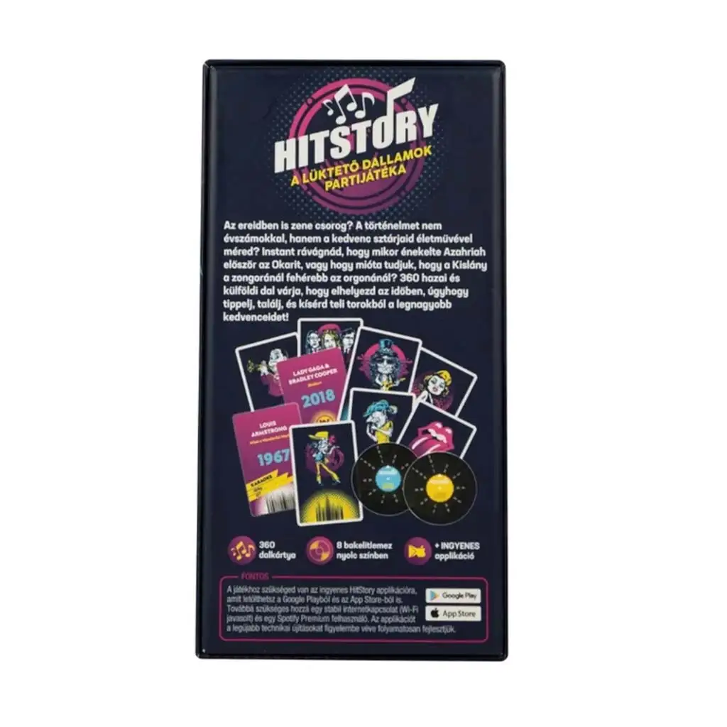 Oživte párty so spoločenskou hrou HitStory, kde je dobrá nálada zaručená a hity znejú naplno! Táto jedinečná párty hra je zároveň hudobným výletom časom aj rýchlou tipovacou súťažou, v ktorej musíte najväčšie domáce a zahraničné skladby zaradiť do správneho časového poradia. Vieš, kedy vyšiel najväčší hit Fluora alebo kedy prerazila Adele? Ak nie, čoskoro zistíš – a pritom sa dobre zasmejete na prekvapivých tipoch!