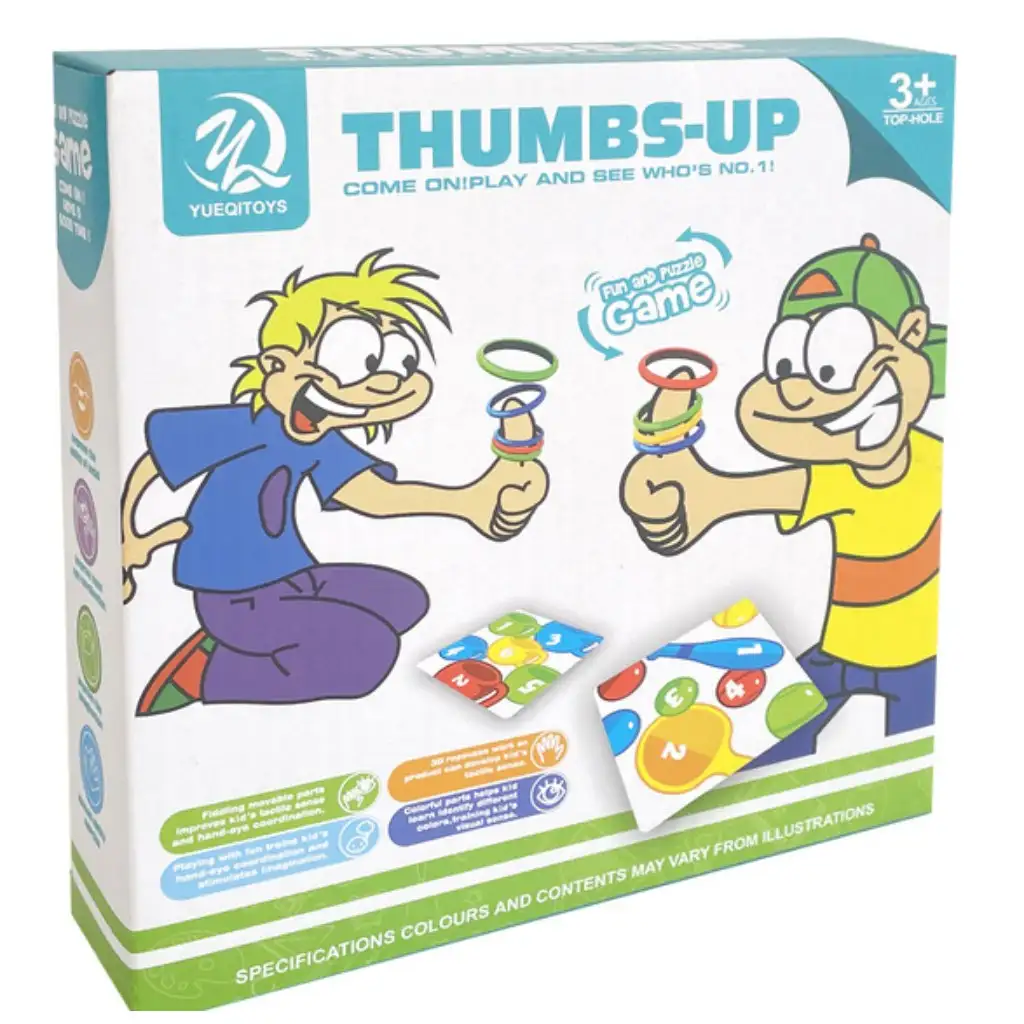 Objavte spoločne hru "Palec hore!" logickú stolovú hru, kde zvíťazí rýchlosť a zručnosť! Táto farebná a vzrušujúca hra je dokonalá na rodinné herné večery, kde si každý môže vyskúšať svoje reflexy. Cieľ je jednoduchý: na základe vzoru na kartách čo najrýchlejšie navliecť na palec prstene správnej farby a tvaru. Je ľahko naučiteľná, takže si ju môžu užívať aj tí najmenší, zatiaľ čo rozvíja schopnosť rozpoznávania farieb a tvarov, ako aj jemnú motoriku.