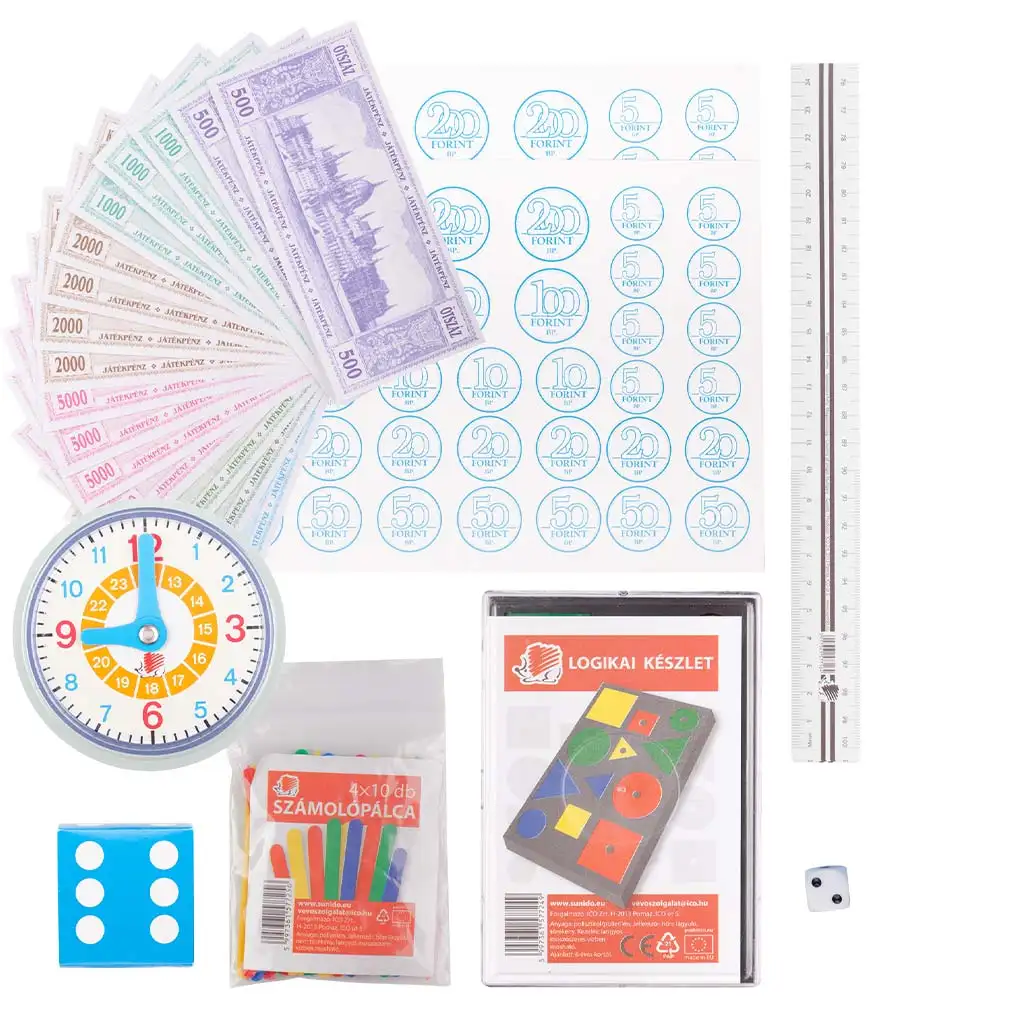 Súprava obsahuje farebné školské hodiny z plastu, s ktorými sa deti hravou formou naučia používať analógové hodiny. Počitadlové paličky a logická sada pomáhajú rozvíjať zručnosti v počítaní a triedení, zatiaľ čo kocky a herné peniaze umožňujú vzrušujúce hry spojené s učením. Zoznamovanie sa s pravítkom začína už v prvom ročníku, preto je jeho súčasťou aj pravítko. Používanie herných peňazí a papierových mincí je vynikajúcou príležitosťou na pochopenie pojmu peňazí, ich hodnoty a základných výpočtov.