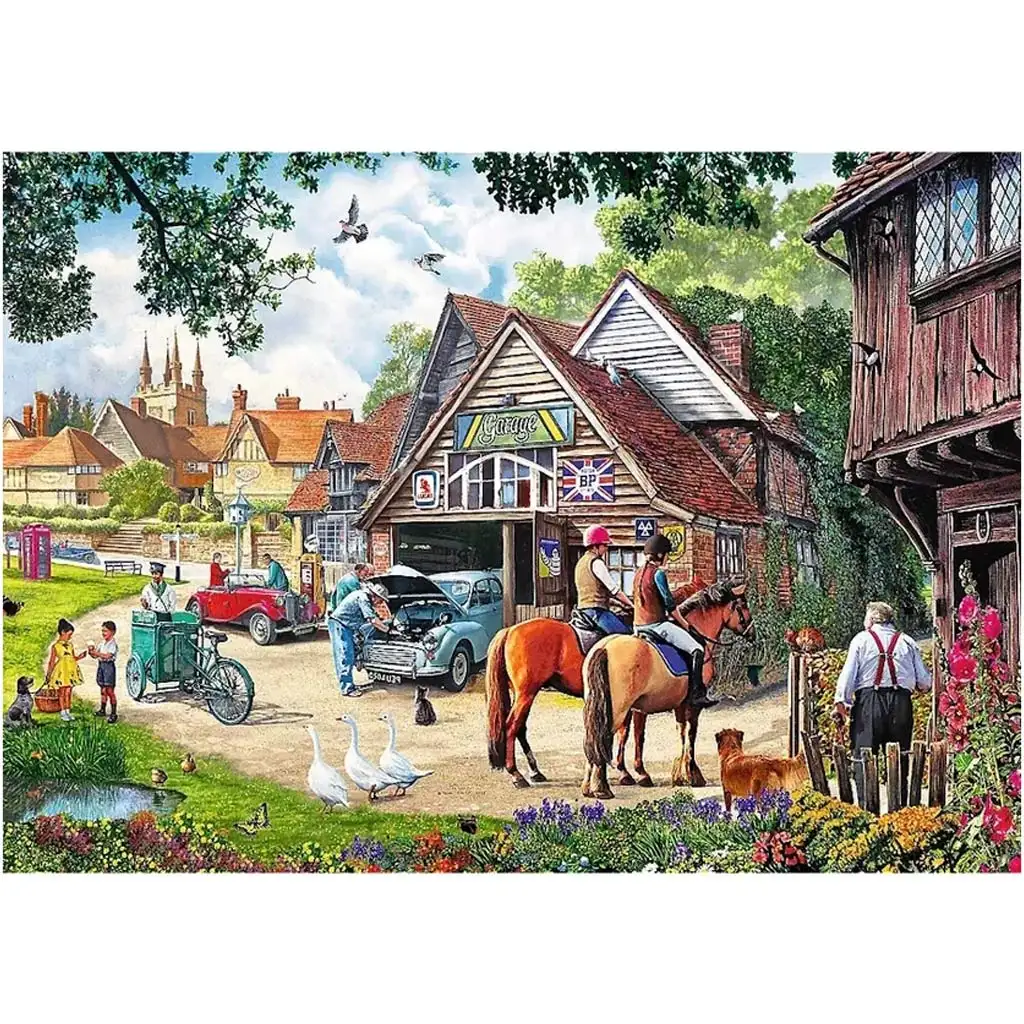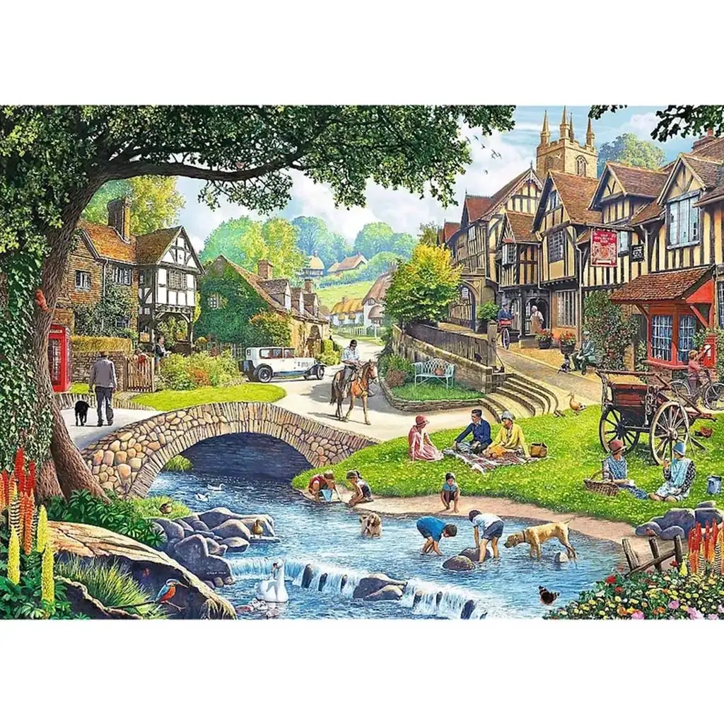 V krabici nájdete dve rôzne, no harmonicky zladené scény. Prvá zobrazuje živé centrum dediny, kde ľudia prichádzajú na koňoch ku klasickej garáži, zatiaľ čo v pozadí atmosféru 50. rokov navodzujú britské vlajky, staré autá a charakteristické budovy. Druhá scéna zachytáva pokojnú, slnečnú piknikovu pri malom potoku, kde sa deti hrajú vo vode, dospelí sa rozprávajú v tráve a za nimi sa rozprestiera pokojná dedina.