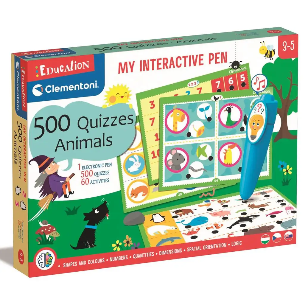 Clementoni 500 Kvízová Sada s Interaktívnym Perom - Zvieratá ponúka deťom úžasný zážitok z hry, ktorý môžu objavovať pomocou hovoriaceho interaktívneho pera. Táto hra je nielen zábavná, ale aj vzdelávacia, pretože obsahuje kvízové otázky, ktoré pomáhajú deťom získavať nové poznatky o zvieratách a svete zvierat.