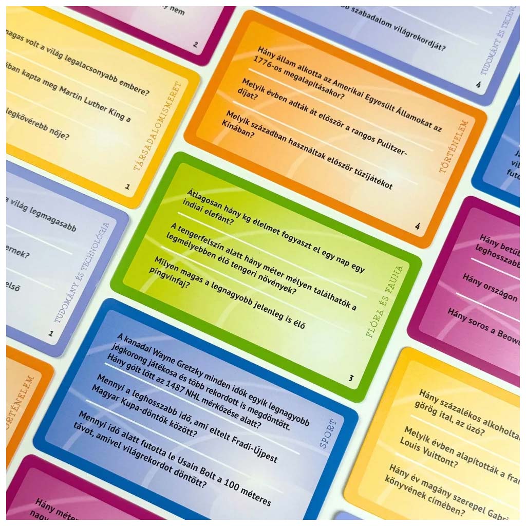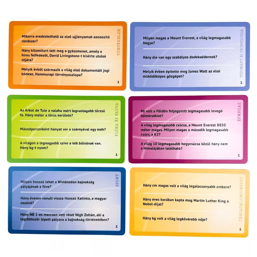 Rýchlosti, roky, dĺžky, hmotnosti, rekordy – počas hry vypláva na povrch množstvo zaujímavých údajov a prekvapivých faktov. Celkovo na vás čaká 1188 otázok v šiestich kategóriách: spoločnosť, príroda, veda, história, šport a mnohé ďalšie vzrušujúce oblasti. Spoločné tipovanie, diskusie a stávky vytvárajú výnimočnú atmosféru, pričom sa pritom nenápadne aj niečo naučíte. Perfektná voľba na rodinné večery a stretnutia s priateľmi, kde sú smiech a zdravé súperenie zaručené.