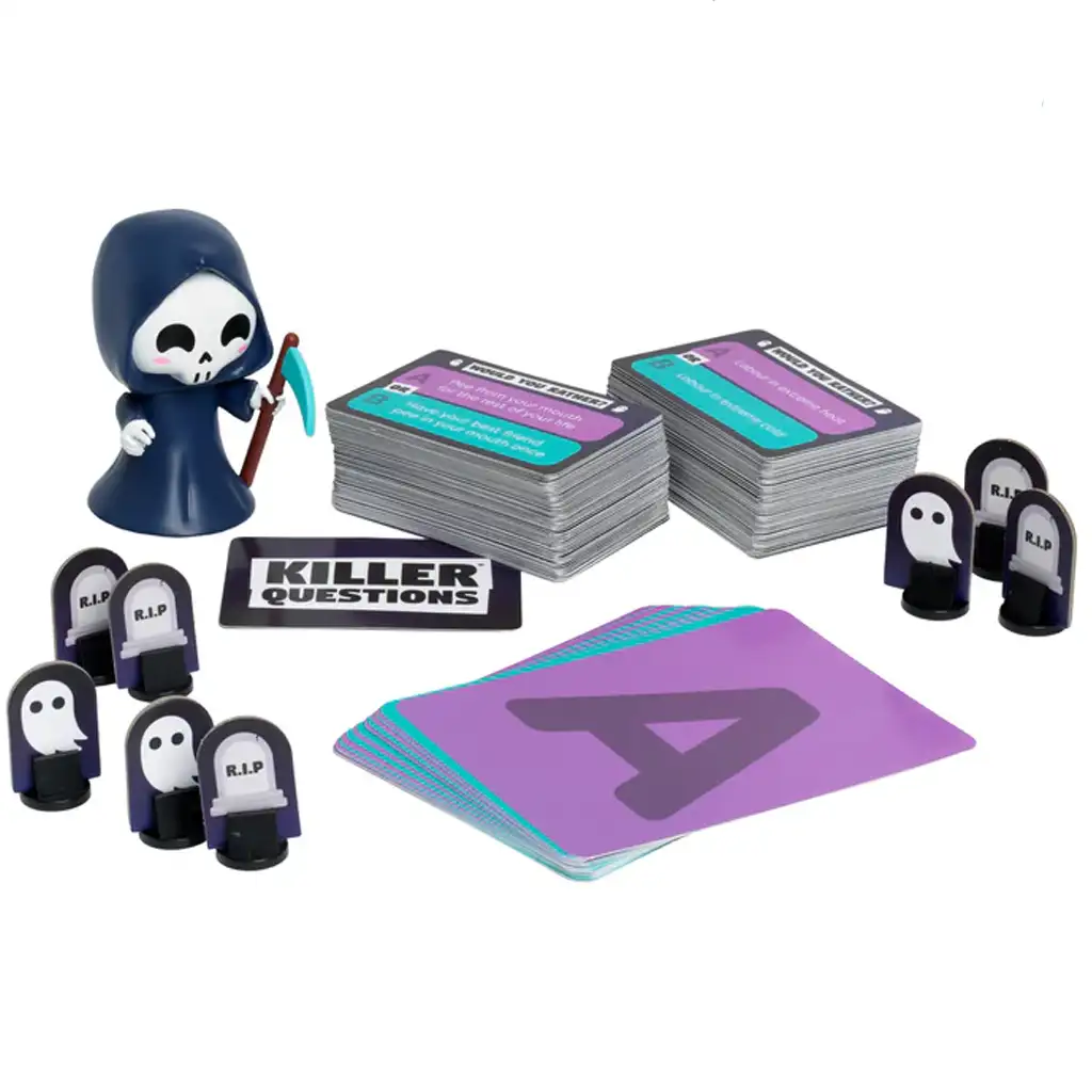 Spoločenská hra Killer Questions zaručene oživí rodinné a priateľské stretnutia! Táto smrteľne vtipná hra otázok a odpovedí môže byť veľkým úspechom nielen medzi deťmi, ale aj medzi dospelými. Podstatou hry je, že hráči si navzájom kladú otázky, medzi ktorými sú aj niektoré naozaj ťažké rozhodnutia – čo by si vybral ty? Hru robí ešte vzrušujúcejšou roztomilá postavička Smrti, ktorá pomáha koordinovať kolá.