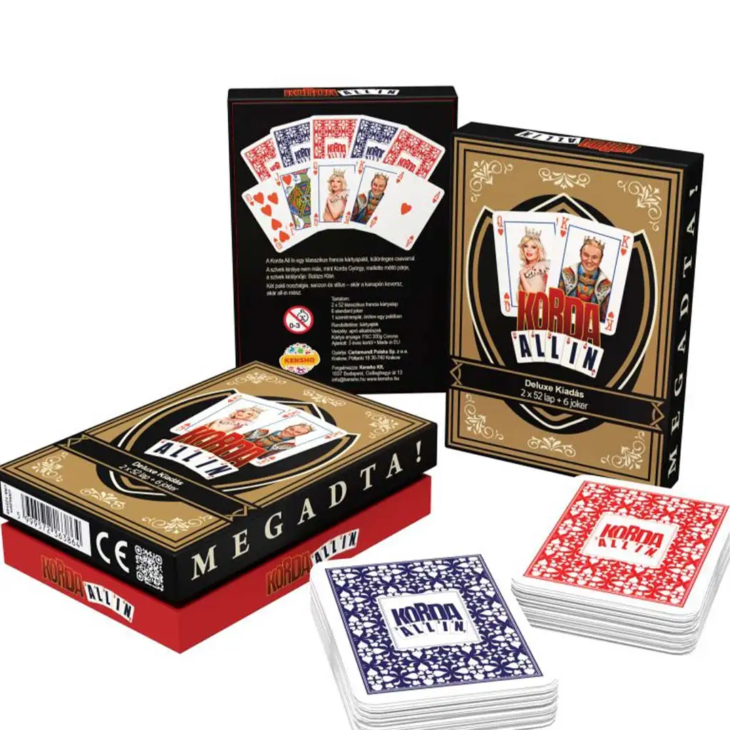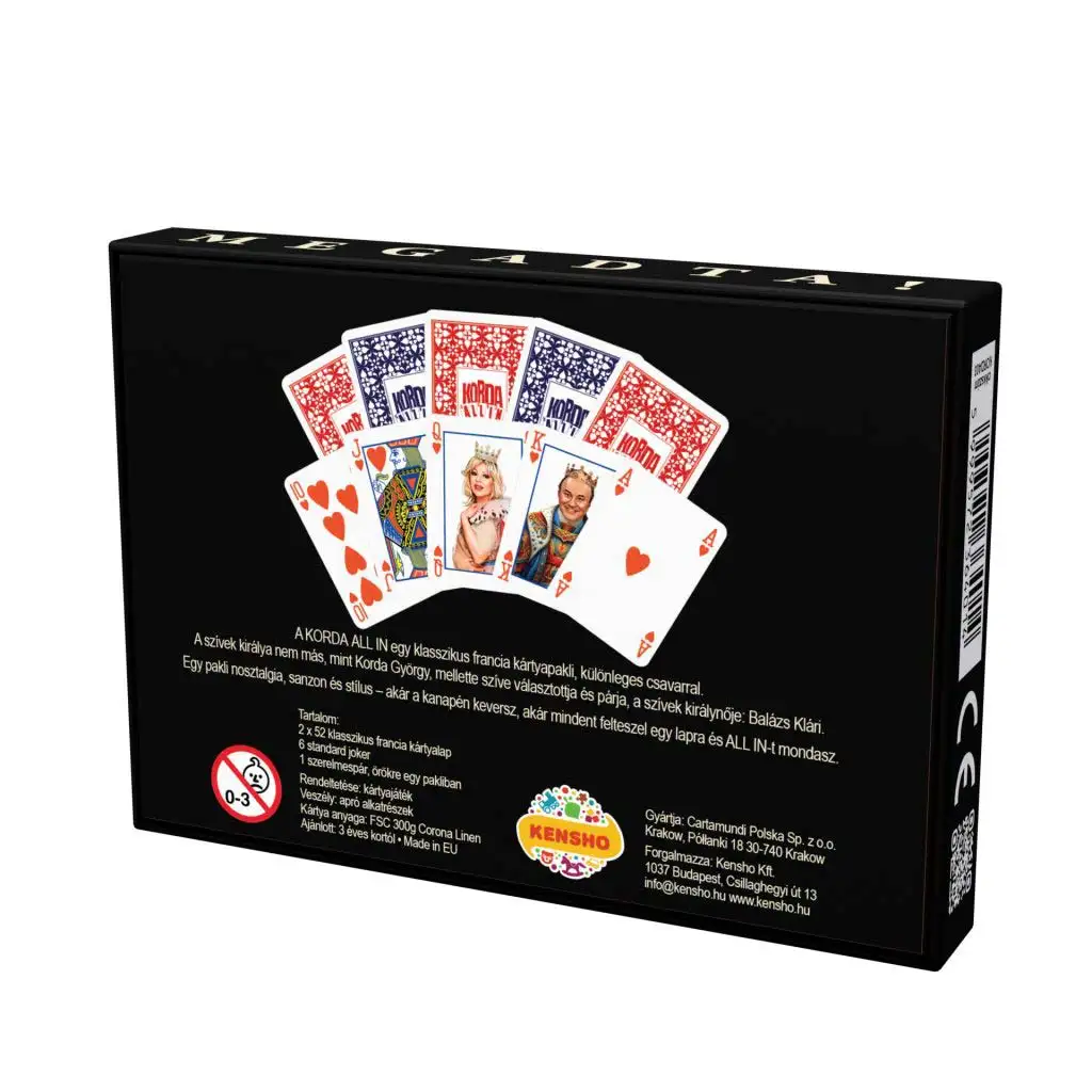 Korda All-In Deluxe francúzsky dvojitý balíček kariet (2×52 kariet + 6 žolíkov) je skutočnou perlou klasického kartárskeho zážitku, ktorý na stôl prináša nielen radosť z hry, ale aj štýl a humor. Toto špeciálne, prémiové vydanie obsahuje dva kompletné francúzske balíčky, spolu 104 kariet a 6 žolíkov, čo z neho robí ideálnu voľbu pre väčšie spoločnosti alebo dlhšie, vážnejšie hry – či už ide o poker, rummy, makaó alebo akúkoľvek inú obľúbenú hru.