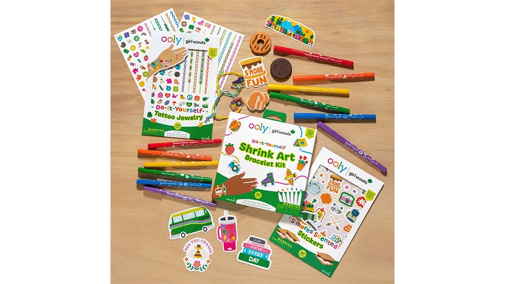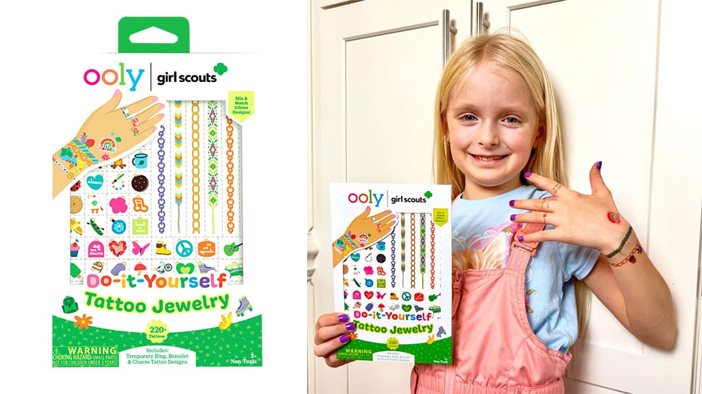 Deti môžu teraz naozaj ukázať svoj osobitý štýl s dvoma výnimočnými, vlastnoručne vyrobenými sadami doplnkov. OOLY x Girl Scouts DIY sada na výrobu náramkov zo zmršťovacej fólie obsahuje všetko, čo deti potrebujú na navrhovanie a zdobenie jedinečných šperkov: fixky, šnúrky a 20 vopred vyrezaných príveskov zo zmršťovacej fólie. Ak by sa vlastnoručne vyrobené dielo náhodou stratilo, žiadny problém — DIY sada dočasných tetovacích šperkov obsahuje tri hárky trblietavých, nalepovacích náramkov, prsteňov a príveskov, takže deti už nikdy nestratia svoje náramky priateľstva! S týmito Kreatívne zručné hračky sa najmenší nielen zabavia, ale rozvíjajú aj svoju zručnosť a sebavyjadrenie.