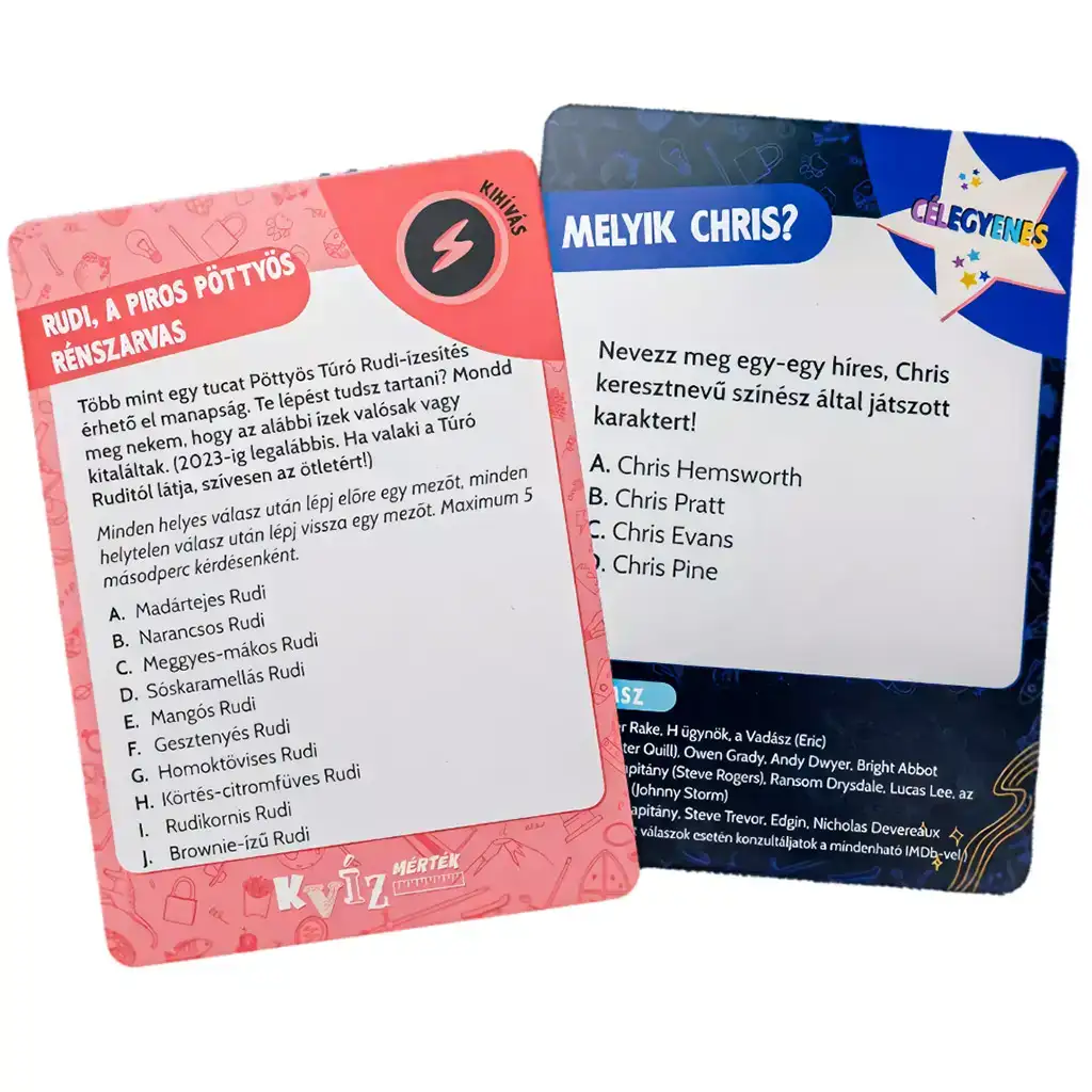 Kvízmérték nie je len obyčajná kvízová hra – dôležitú úlohu tu zohráva aj taktika a tímová spolupráca. Rôzne karty výziev môžu do hry priniesť nečakané úlohy, ktoré dokážu úspešne zvládnuť len tie najlepšie zohraté tímy. A keď sa dostanete do cieľovej rovinky, od víťazstva vás delí už len posledná otázka – ale kto sa odváži pustiť do najťažšej úlohy, aby získal konečné víťazstvo?