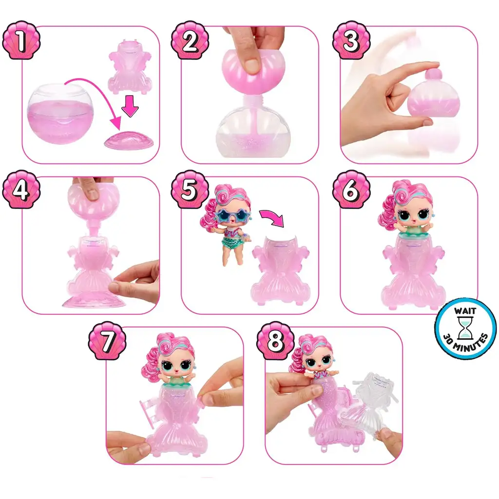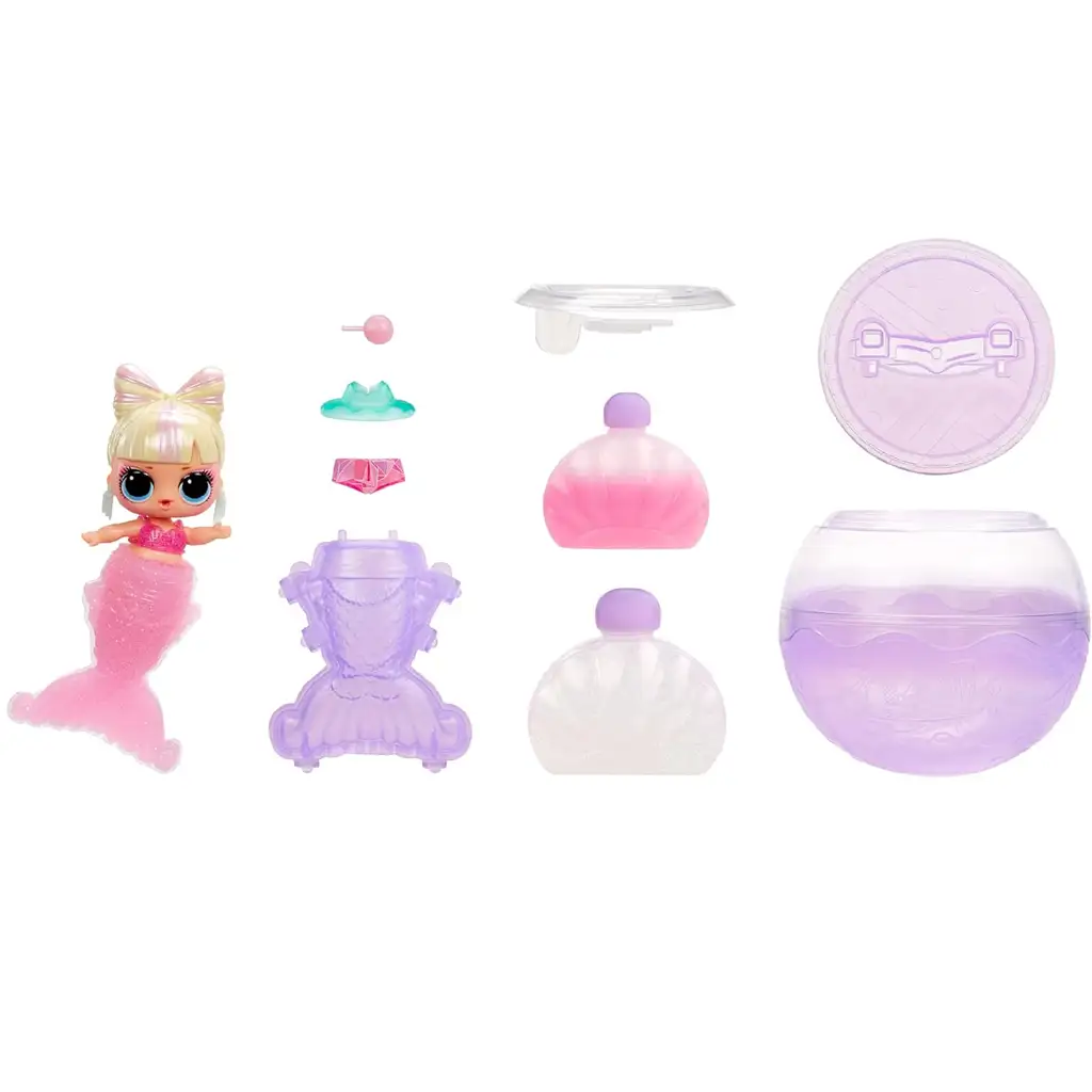 L.O.L. Surprise Prekvapenie morská panna drobnosti poskytujú naozaj magický zážitok pre každého malého fanúšika! Tieto špeciálne mini morská panna bábiky majú plutvy meniace farbu a poskytujú jedinečný „urob si sám“ zážitok, pretože si môžeš sám vytvoriť trblietavý chvost bábiky.