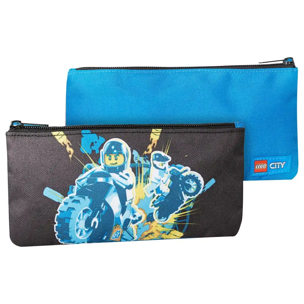 Puzdro má obojstranný dizajn: na jednej strane je dynamická, akčná LEGO motorkárska scéna, zatiaľ čo druhú stranu zdobí žiarivá modrá farba a logo LEGO City. Pevný priečinok uzatváraný zipsom ochráni uložené písacie potreby pred vypadnutím a ponúka dosť miesta na perá, ceruzky, gumy a dokonca aj pravítko.