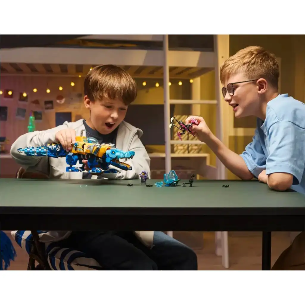 Deti môžu s touto stavebnicou LEGO® DREAMZzz™ Krokodília ponorka (71512), určenou pre chlapcov a dievčatá od 8 rokov, naplno rozvinúť svoju kreativitu. Sada ponúka dva vzrušujúce spôsoby stavania, vďaka ktorým môžu snílkovia model ponorky prestavať na krokodíla alebo na lietajúceho orla. Ponorka je vybavená dvojitými delami, skrytým úložným priestorom a kokpitom pre minifigúrku. V krokodílom móde má pohyblivú hlavu, nohy a chvost, zatiaľ čo v orlom móde jej pohyblivé krídla a pierka vychádzajú z motorov. Fantázii sa medze nekladú vďaka minifigúrkam Logana, Zoey a Ariky, ako aj postave Prízraku, dvom pavúkom a zberateľskej figúrke Modrého pokladu. Logan má zberateľský modrý meč, Zoey luk a Arika kosu. Stavebnica je skvelým darčekom pre chlapcov aj dievčatá a obsahuje príbehom vedený sprievodca stavbou, ktorý deti vtiahne do dobrodružstva. Návody sú digitálne dostupné aj v aplikácii LEGO Builder, kde si môžu stavitelia svoje výtvory priblížiť, otáčať a sledovať svoj pokrok. Sada obsahuje 1107 dielikov.