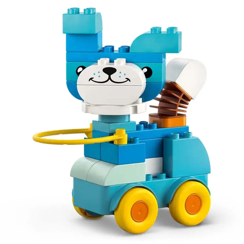 Inšpiruj malých detí k tvorivosti so stavebnicou 3 v 1 Rútiace sa zvieratá (10448)! Malí milovníci zvierat si môžu užívať fantazijnú hru rôznymi spôsobmi, keď stavajú kačku, rybu a psa určené pre škôlkarov, ale môžu si tiež vymýšľať celkom nové zvieratá! Deti v predškolskom veku, ktoré milujú vozidlá LEGO® DUPLO®, môžu postaviť figúrky na kolieskovú základňu, aby mohli pretekať alebo ich ťahať za rukoväť.