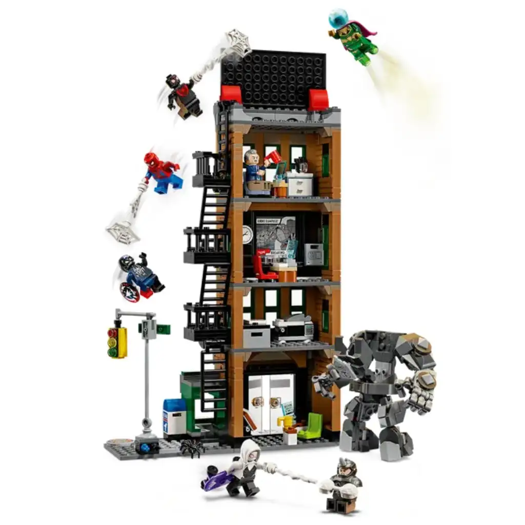 Objav superhrdinské akcie na 4 poschodiach so setom Spider-Man vs. Mysterio: Denný Bugle (76342), ktorý je pavučinovým stavebným setom určeným pre chlapcov, dievčatá a deti od 10 rokov. Tento zberateľský spider-manovský stavebný set je skutočným zážitkom na stavanie i vystavenie a hranie sa s ním je veľmi zábavné, pretože je plný LEGO® ǀ Marvel minifigúrok a dobrodružstiev. Ku stavebnici Denný Bugle ǀ Marvel patria minifigúrky Spider-Mana, Milesa Moralesa, Ghost Spider, J. Jonah Jamesona, Mysteria, venomizovaného Kapitána Ameriky a Rhinoa. Akcie vo vzduchu umožňujú 3 priehľadné tyče a 2 priehľadné kocky. Súčasťou setu je aj kĺbový Rhino-robot s otváracou kabínou. V prepracovanom interiéri budovy nájdeš kancelárie, recepciu, redakčné stroje, trezor s hotovosťou a páku na prepínanie správ na tabuli. Vonkajšok obsahuje núdzový východ, pohyblivý novinový stojan a roh ulice so semaformi. Stiahni si aplikáciu LEGO® Builder, aby si mohol zažiť spoločné stavanie s priateľmi a rodinou vďaka funkcii „Stavanie spoločne“! Stavebnica obsahuje 781 dielikov.