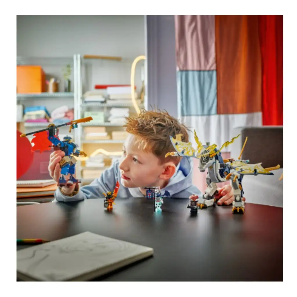 • Robot a drak – Deti sa môžu hrať s figúrkami samostatne alebo upevniť nastaviteľného robota na prvého NINJAGO® robotického draka a vytvoriť tak figúrku robota dračieho jazdca Rouge