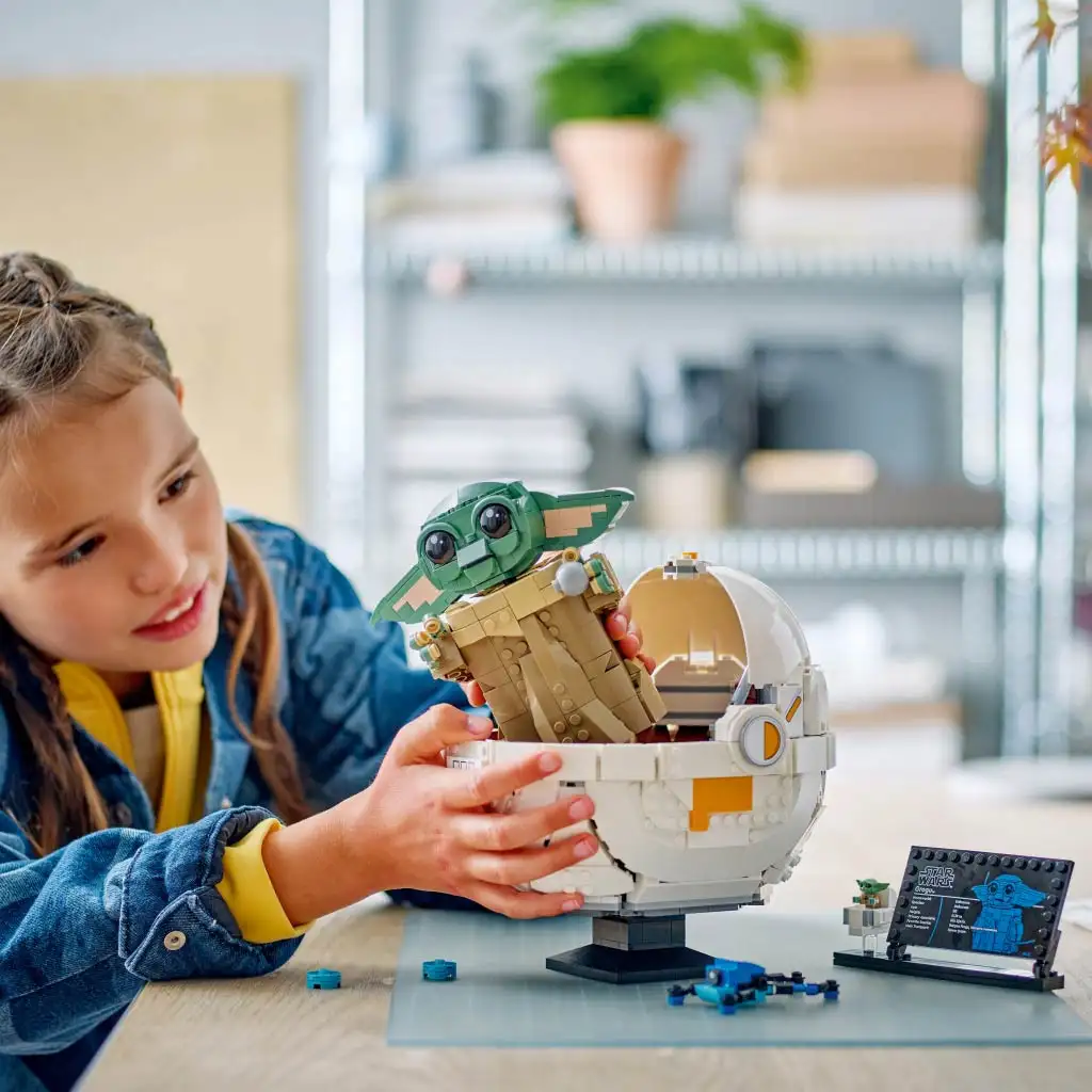 K tejto zberateľskej stavebnici Star Wars patrí aj normálna veľkosť zostaviteľnej figúrky Grogu sediacej v malej kolíske a informačná tabuľka, aby bola veselá dekorácia kompletná.