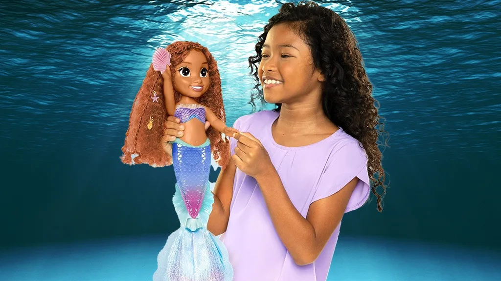 Disney Junior Splash & Glow Ariel bábika od Just Play, navrhnutá pre deti od 3 rokov, je prispôsobiteľná s priloženými korálkami do vlasov a tiarou. Deti môžu stlačiť mušľový náhrdelník bábiky, aby počuli zvukové efekty a novú úvodnú pieseň. Keď sa dostane do vody, Arielin chvost svieti dúhovými svetlami a strieka vodné prúdy v sukňovom vzhľade.