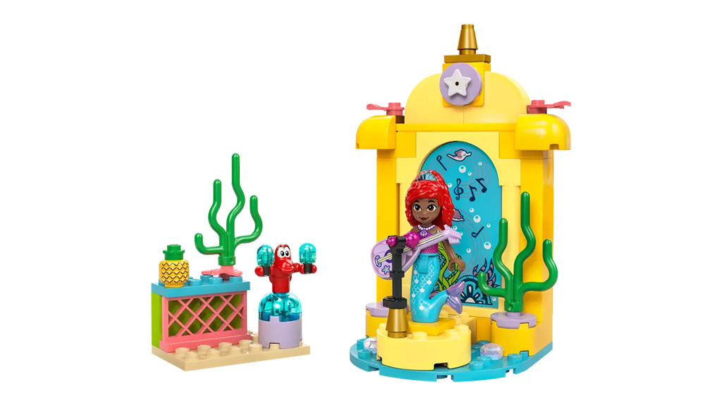 Tento 141-dielny stavebný set morskej panny obsahuje figúrky Ursuly, Ariel a Floundera. Súčasťou stavebného setu je jaskyňa s otočnou platformou, "veľrybie vozidlo" a "vrak lode". Dátum vydania: 1. júla.Vytvorte hudbu s Ariel a Sebastianom! Táto 60-dielna LEGO súprava obsahuje otáčajúci sa tanečný parket, osviežujúci kútik a kompletnú zbierku LEGO doplnkov. Súprava bude dostupná od 1. júla.LEGO rozširuje svoju kolekciu produktov Ariel o dve nové sady. Sada Arielina kryštálová jaskyňa obsahuje 141 dielikov a je odporúčaná pre malých staviteľov od 4 rokov. Sada obsahuje LEGO Disney minifigúrky Ursuly a Ariel, ako aj LEGO figúrku Floundera.