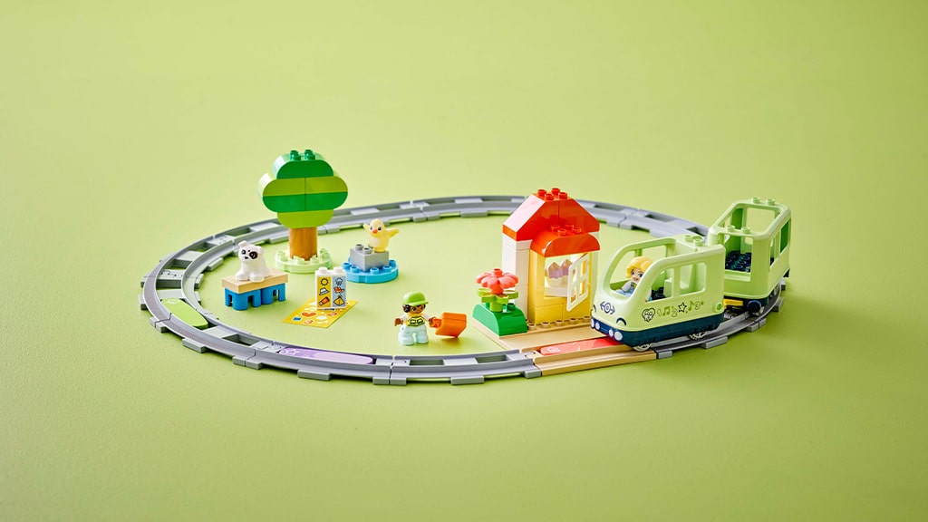 Táto súprava obsahuje štyri LEGO DUPLO figúrky, jeden Push&Go vlak, 14 koľajových dielov, tri cieľové stanice (malú stanicu, park alebo pláž), tri akčné kocky a ďalšie doplnky. Vlak má Push&Go dizajn, takže deti ho stačí jemne postrčiť a vlak sa už rozbehne po koľajniciach.
