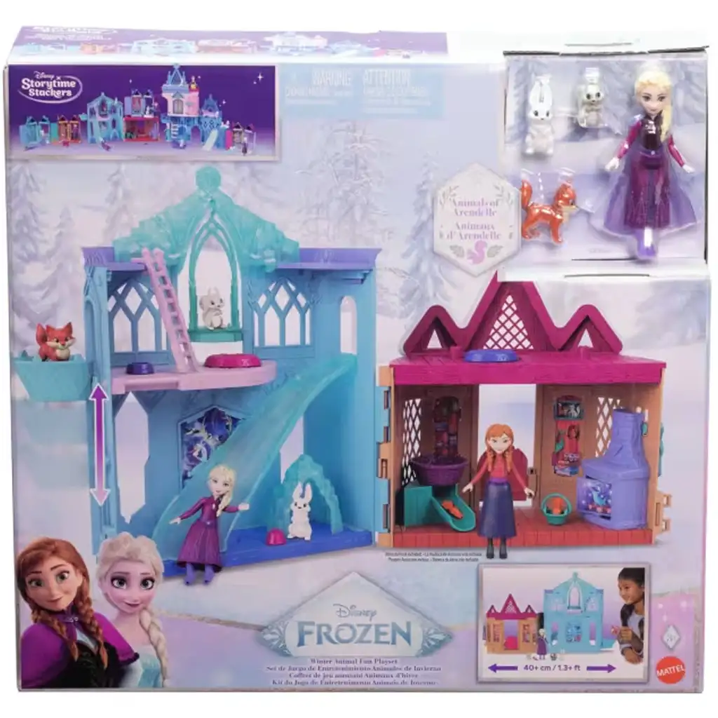 Zvieratká sa môžu šmýkať po šmykľavke, využívať interaktívny výťah, oddychovať na pohodlných miestach a sú tu aj prvky na kŕmenie zvieratiek, čo všetko prispieva k fantazijnému a starostlivému hranému svetu. Set je kompatibilný s ďalšími sadami Disney Storytime Stackers, takže kráľovstvo Frozen-univerza je možné rozširovať a ďalej budovať.