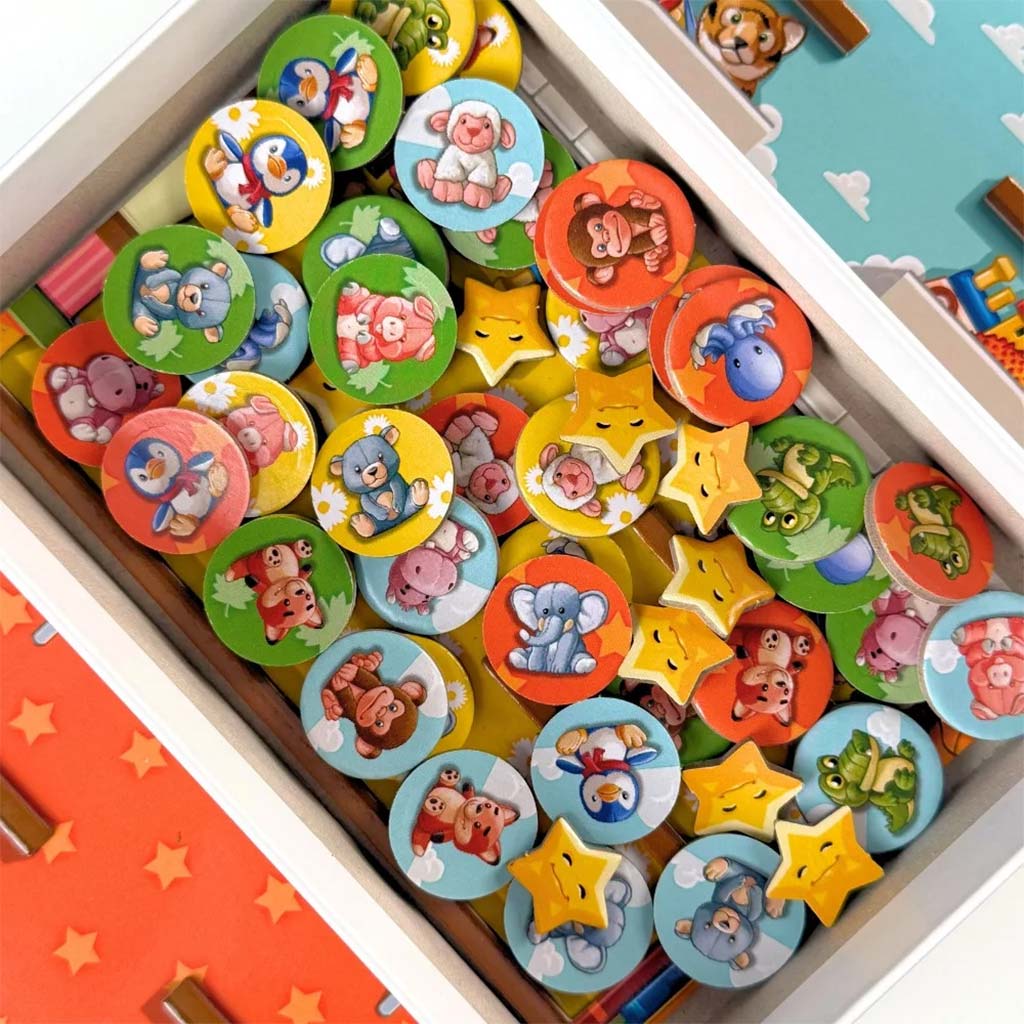 - Obsah balenia: 40 žetónov s obrázkami plyšových hračiek (10 kusov pre každého hráča pri hre pre 4 hráčov), 4 hracie dosky spální (po jednej pre každého hráča), 24 cieľových kariet (ľahký režim na jednej strane, ťažký režim na druhej), 9 hviezd