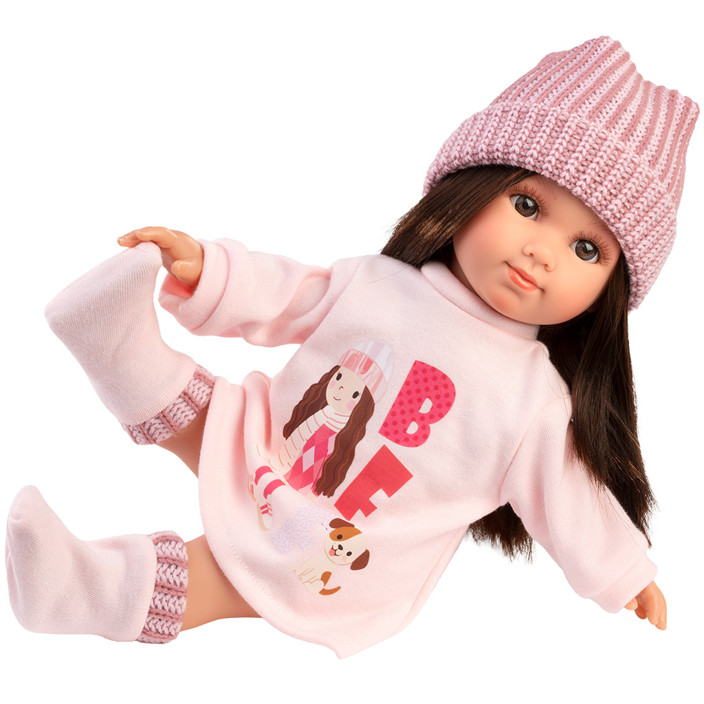 A Llorens: bábika Sara vysoká 35 cm v ružovej pletenej čiapke je naozaj rozkošná a štýlová hračka, ktorá si ľahko získa srdce tvojho dieťaťa. Bábika má dlhé tmavohnedé vlasy a milý výraz tváre, čo jej dodáva realistický vzhľad, vďaka čomu je hranie rolí ešte zábavnejšie. Na obrázku viditeľné mäkké ružové šaty a k nim ladúca pletená čiapka nie sú len módne, ale tiež vytvárajú pocit tepla a domácej útulnosti. Vďaka svojej ľahkej veľkosti je ideálna na objímanie, prenášanie a každodennú hru, pričom podporuje starostlivosť a predstavivosť.
