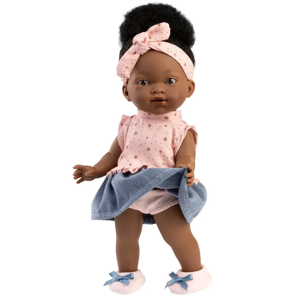 Bábika je detailne spracovaná a verne odráža vysokú kvalitu, na ktorú sme zvyknutí od španielskej značky Llorens. Pôvabná tvár, jemne maľované oči a pery, ako aj prirodzene vyzerajúce vlasy robia Zoé naozaj realistickou. Roztomilá čelenka s mašľou ešte viac zvýrazňuje jej hravý charakter a vysoko vyčesaný kučeravý drdol jej dodáva štýlový vzhľad. Ružový top s hviezdičkovým vzorom a sukňa s džínsovým efektom sa k sebe dokonale hodia, vytvárajúc hravý, moderný a zároveň detský outfit.