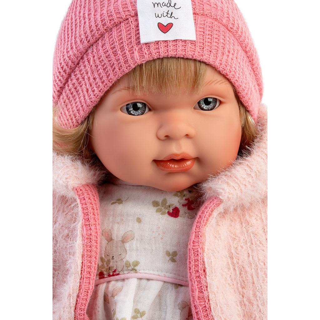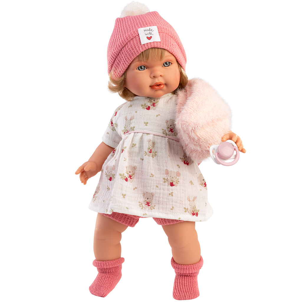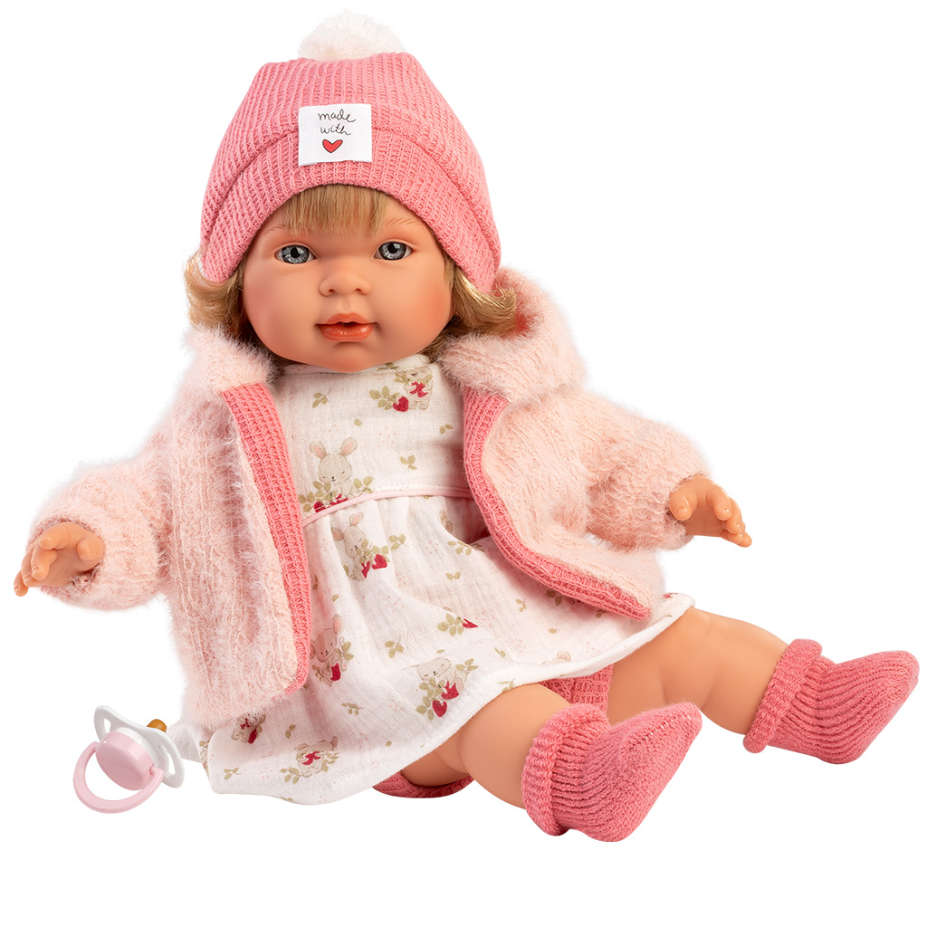 Llorens: Carla, plačúca 42 cm bábika s cumlíkom v čiapke so srdiečkami.
