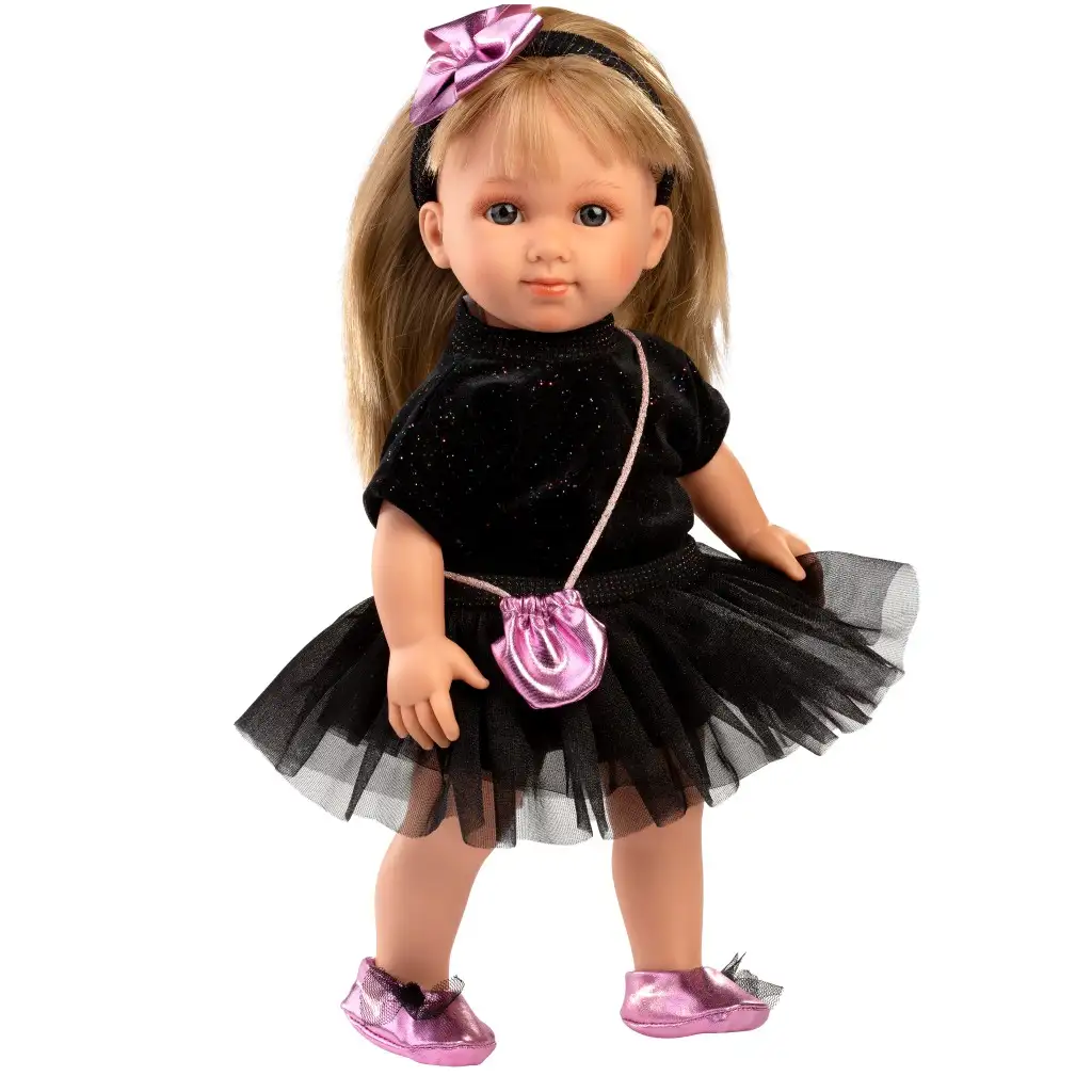 Bábika Llorens Elena je vrcholom elegancie a štýlu vo všetkých detailoch! S výškou 35 cm sa dokonale hodí do náručia detí, čo umožňuje jej ľahké zapojenie do každodenných hier. Elenino čierne, trblietavé šaty ju premenia na pravú párty kráľovnú, zatiaľ čo lesklé fialové doplnky, ako sú pásková čelenka, taška a topánky, jej dodávajú pravú večernú atmosféru. Jemné, svetlé vlasy a životný výraz tváre zaručujú, že bude stále v centre pozornosti. Deti si zamilujú, ako Elena dokonale doplní prípravu na špeciálne príležitosti a elegantné rolové hry. Každá bábika Llorens je ručne vyrobená zo Španielska, s vynikajúcimi detailmi a použitím starostlivo vybraných materiálov, aby spĺňala najvyššie štandardy kvality. Bábika prichádza v krásnej dekoratívnej krabici, čo ju robí ideálnou voľbou pre deti aj zberateľov.