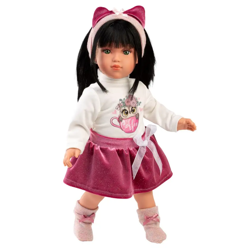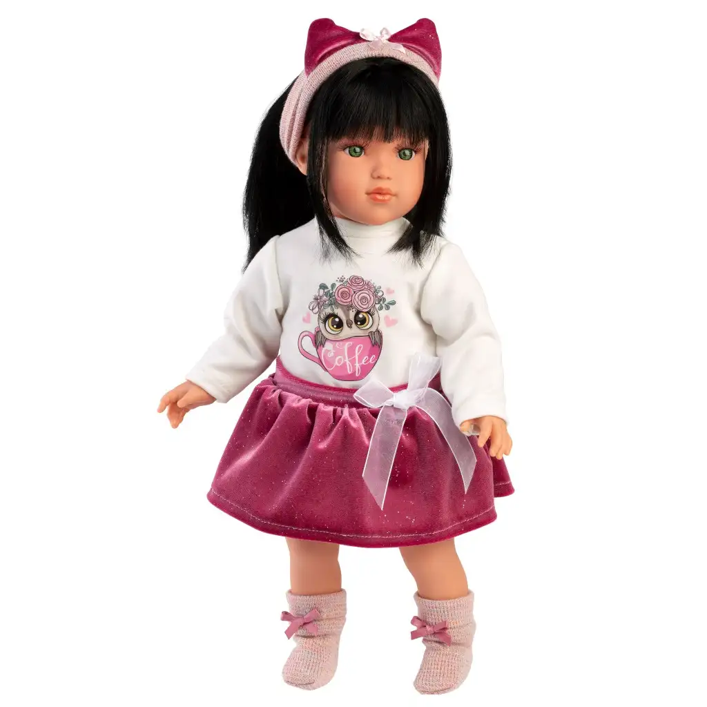 Stretnite sa s Grétou, 40 cm vysokou bábikou od Llorens, ktorá svojou pôsobivou osobnosťou okamžite získa srdce vášho dieťaťa! Gréta má životný výraz a okúzľujúce zelené oči, nosí štýlovú blúzku s motívom sovy a trblietavú ružovú sukňu, čo je vždy trendy voľba vo svete bábik. Doplnky ako pásková čelenka a roztomilé trblietavé topánky ešte zvýrazňujú jej elegantný vzhľad. Gréta má dlhé, hodvábne čierne vlasy, ktoré sú vhodné na vytváranie rôznych účesov, takže deti môžu stráviť hodiny kreatívnym a módnym úpravám vlasov. Každá bábika Llorens je ručne vyrobená zo Španielska, s vynikajúcou detailnou prácou a použitím starostlivo vybraných materiálov, aby spĺňala najvyššie štandardy kvality. Bábika prichádza v krásnej dekoratívnej krabici, čo je ideálna voľba pre deti aj zberateľov.