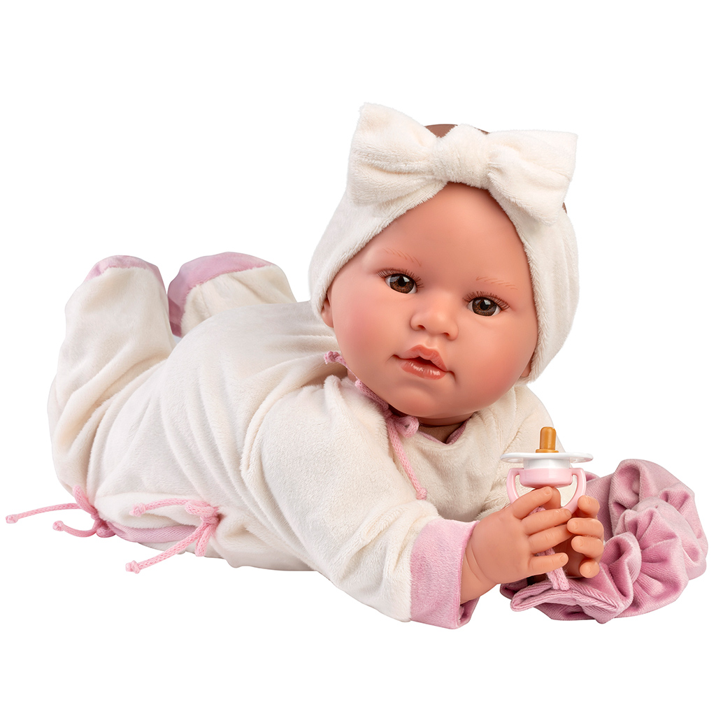 Bábika Llorens Lea, 45 cm, ktorá plače a má dupačky s motívom koaly, je naozaj rozkošná voľba, ak hľadáte pre svoje dieťa milú bábiku, ktorá povzbudzuje k starostlivosti. Bábika má na sebe mäkké krémové dupačky zdobené roztomilým motívom koaly a jemnými ružovými detailmi. Zladená čelenka s mašličkou jej vzhľad ešte viac zvýrazňuje. Realistický výraz tváre a detailné spracovanie pomáhajú pri vžití sa do rolí pri hre. Bábiku s funkciou plaču možno ľahko upokojiť cumlíkom, takže vaše dieťa si môže vyskúšať radosť z opatery. Fľaštička a mäkký textilný doplnok ďalej obohacujú herný zážitok.