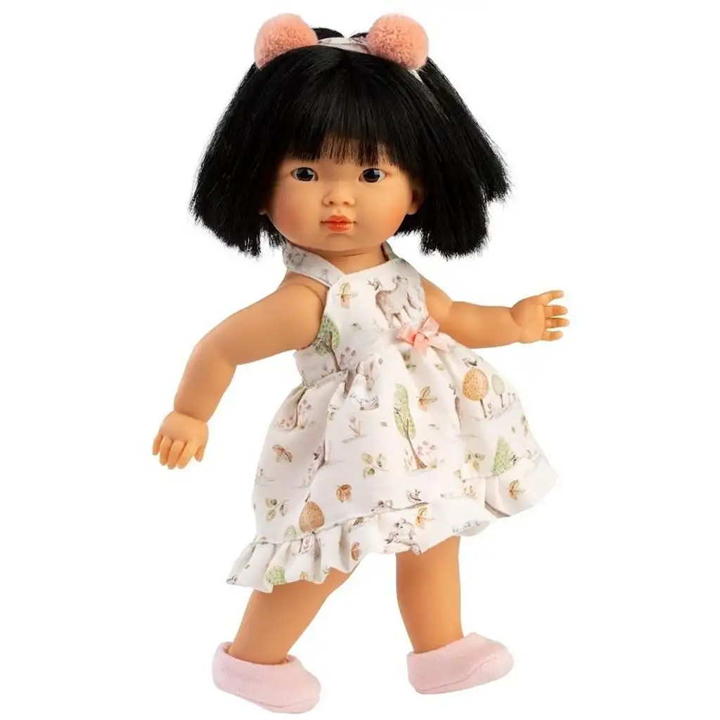 Lu je očarujúca, 28 cm vysoká bábika, ktorá je dokonalou kombináciou pôvabu a hravosti. Vďaka svojej malej veľkosti je ideálna aj pre najmenších, ľahko sa drží, objíma a môžete ju vziať kamkoľvek so sebou. Jej strapcová, ružová čelenka a prirodzene vyzerajúci, rovný čierny účes ju robia naozaj výnimočnou a štýlovou, zatiaľ čo veselý, zvierací vzor letných šiat zabezpečuje, že každá hra je radostná.
