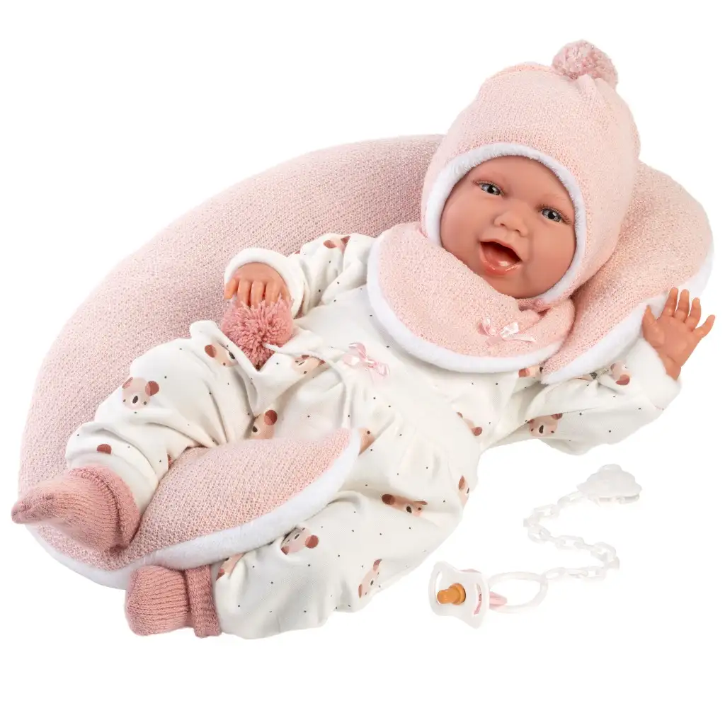Llorens: Mimi 42 cm bábika so zvukom, s brušným vankúšom v medvedíkovom oblečení.