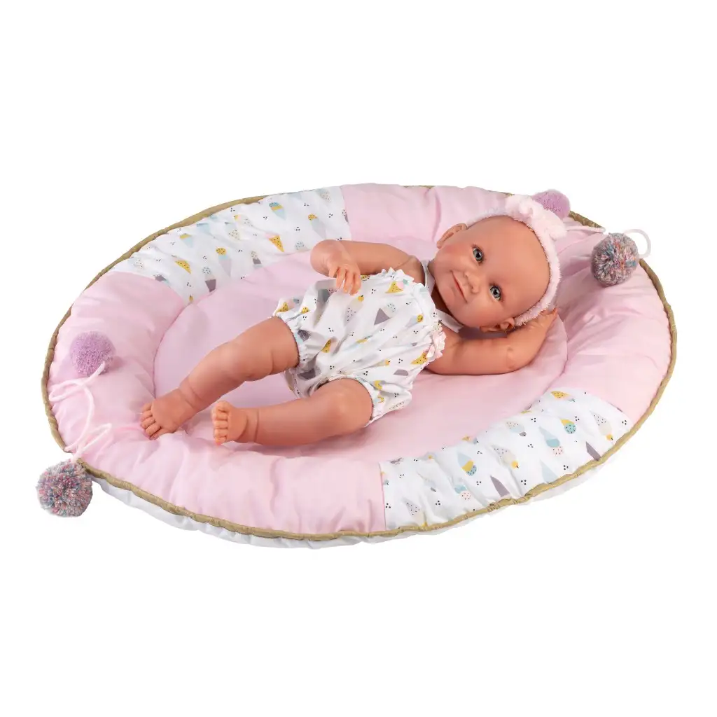 Bábika Llorens Nica, ktorá prichádza s dĺžkou 40 cm a očarujúcim oblečením s motívom zmrzliny, bude skutočnou radosťou pre deti! Bábika má životný výraz tváre a žiarivé modré oči, ktoré vyžarujú teplo, a detaily, ako sú pekne tvarované prstíky, jej dodávajú ohromujúcu realistickosť. Telo bábiky Nica z plastu zaručuje dlhú trvanlivosť a je ľahko umývateľné, takže hra môže prebiehať v čistom prostredí hodiny. Krásna postieľka, vyrobená z jemného ružového materiálu a ozdobená chlpatými pompónmi, je dokonalým miestom pre odpočinok bábiky, zároveň slúži ako vynikajúca dekorácia detskej izby. Každá bábika Llorens je ručne vyrobená zo Španielska, s výnimočne detailným spracovaním a starostlivo vybranými materiálmi, aby spĺňala najvyššie kvalitatívne štandardy. Bábika prichádza v nádhernom dekoračnom boxe, čo je ideálna voľba pre deti aj zberateľov.